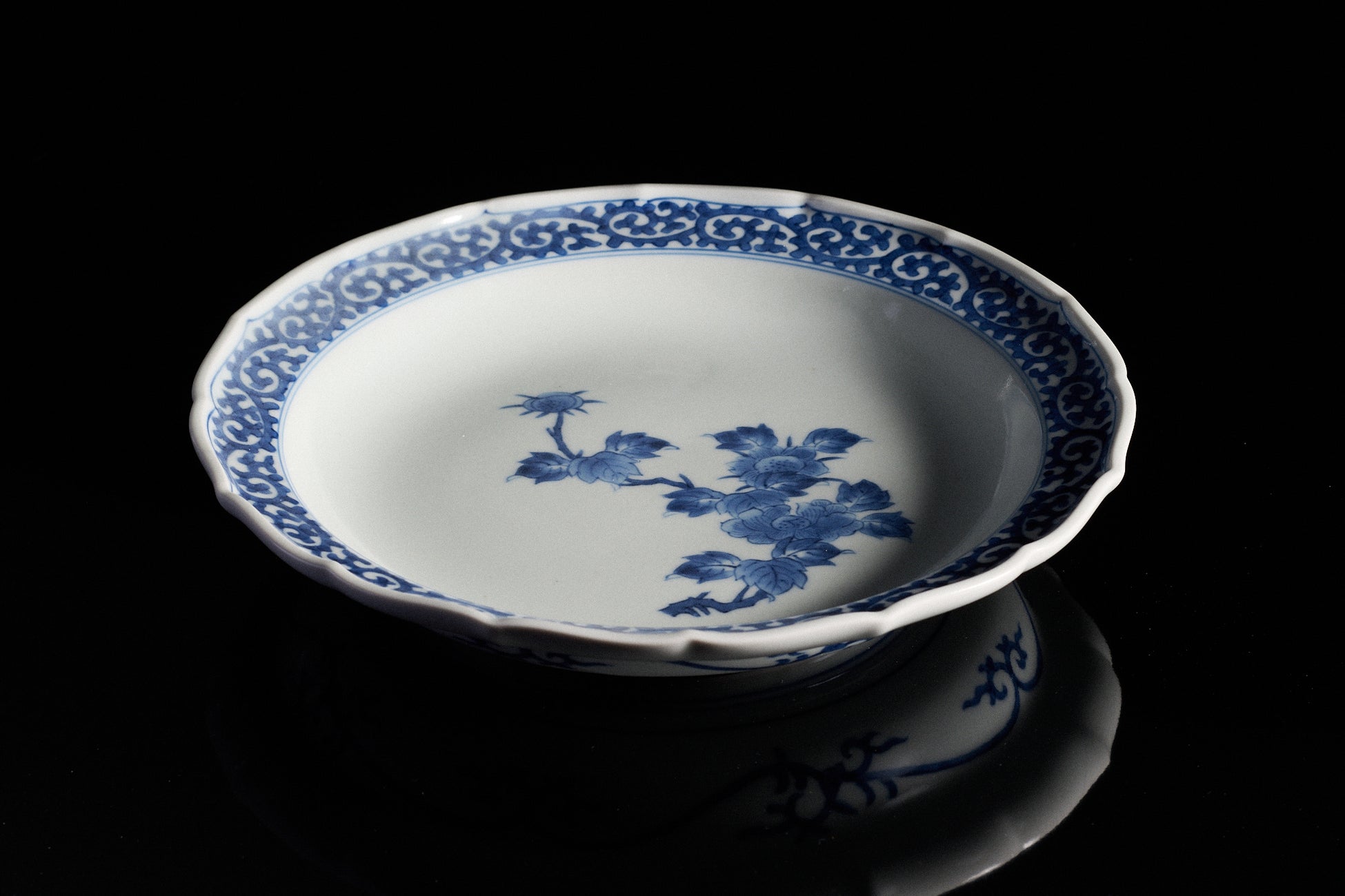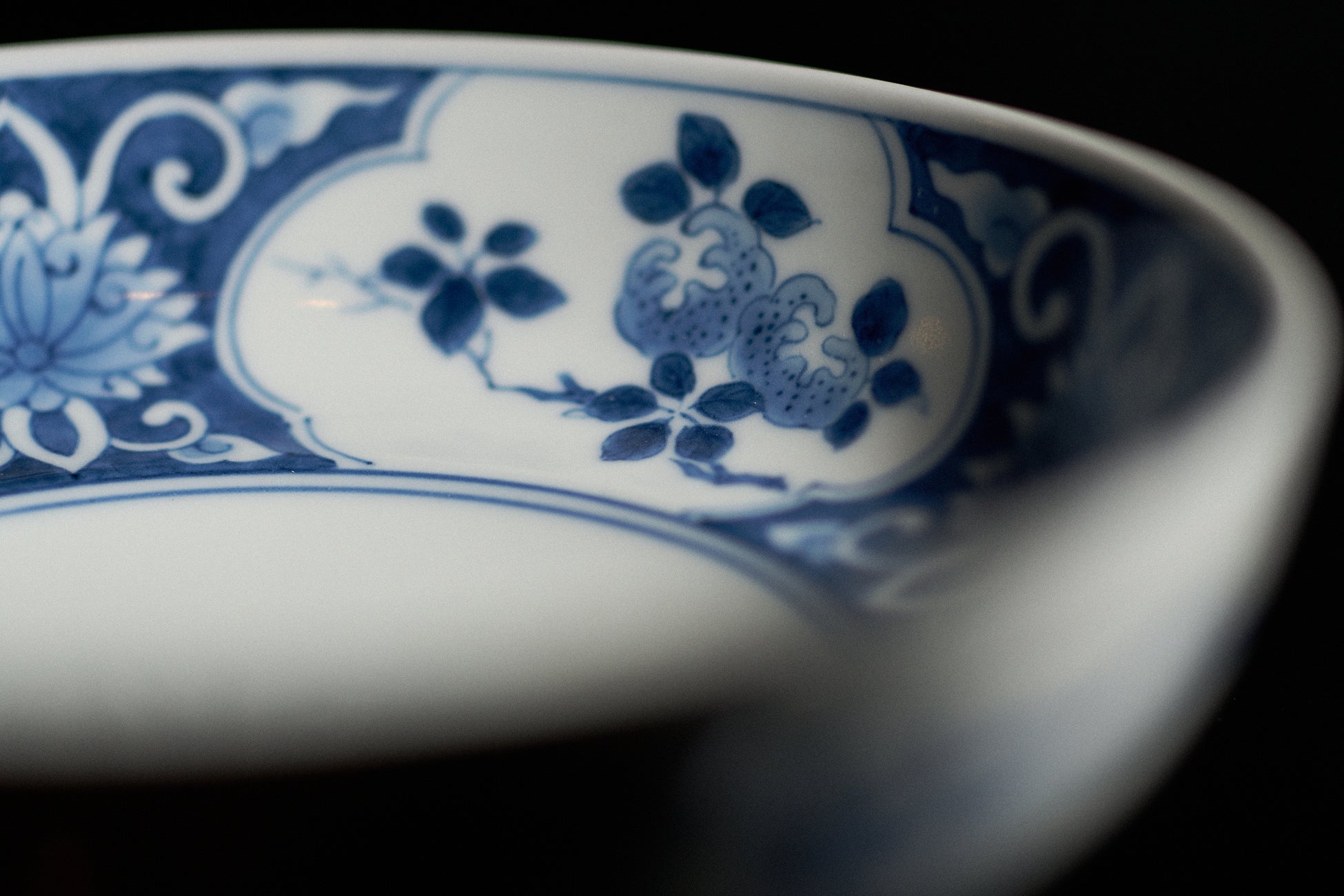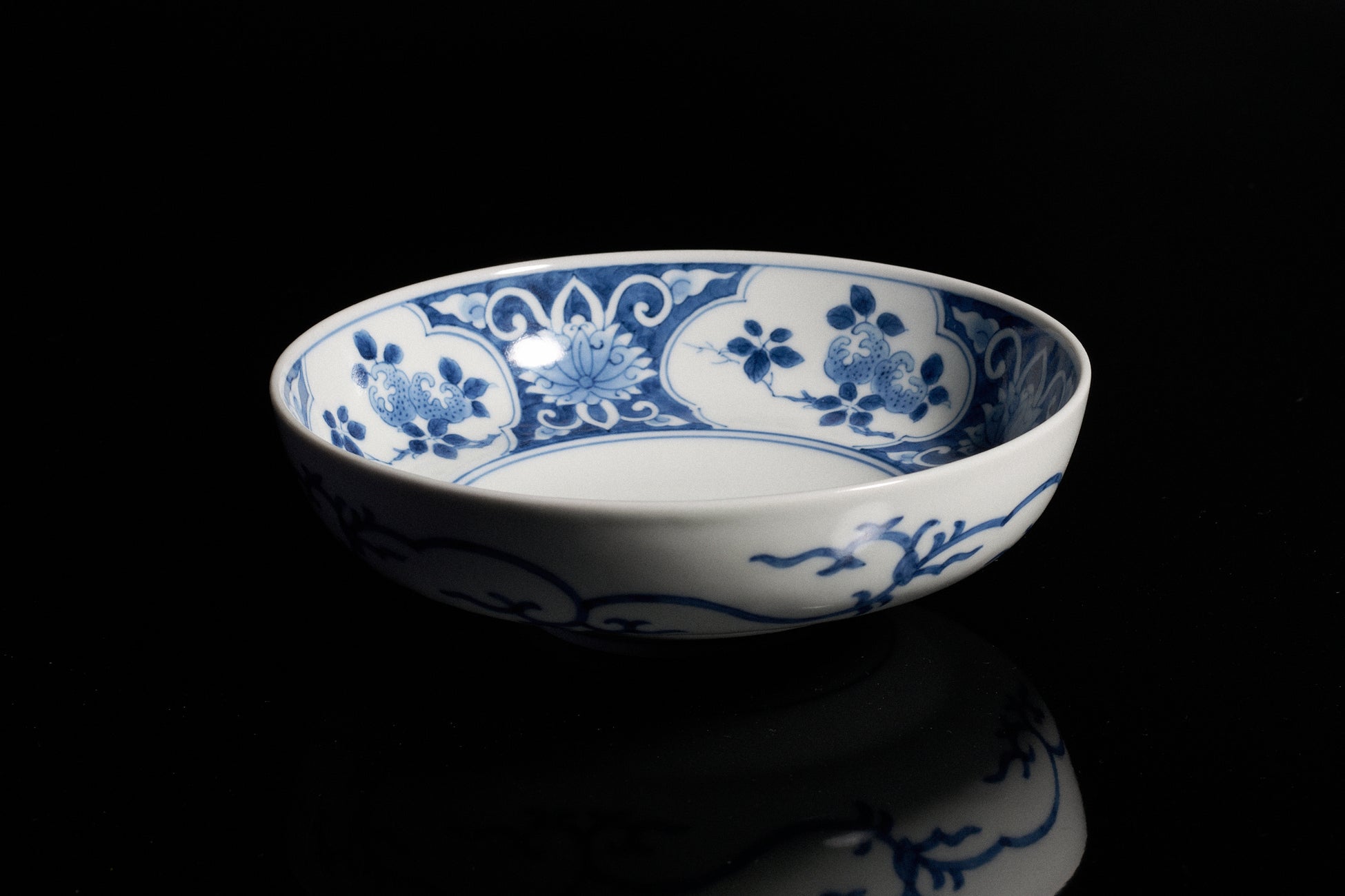 内面周囲の四方にはザクロの折枝文を描いた窓を配し、その間に花唐草文を挟んだ小鉢です。繊細で端正な線描きと、その中に塗られた濃淡の対比が美しい濃(だ)みが、そこはかとない上品さを漂わせています。