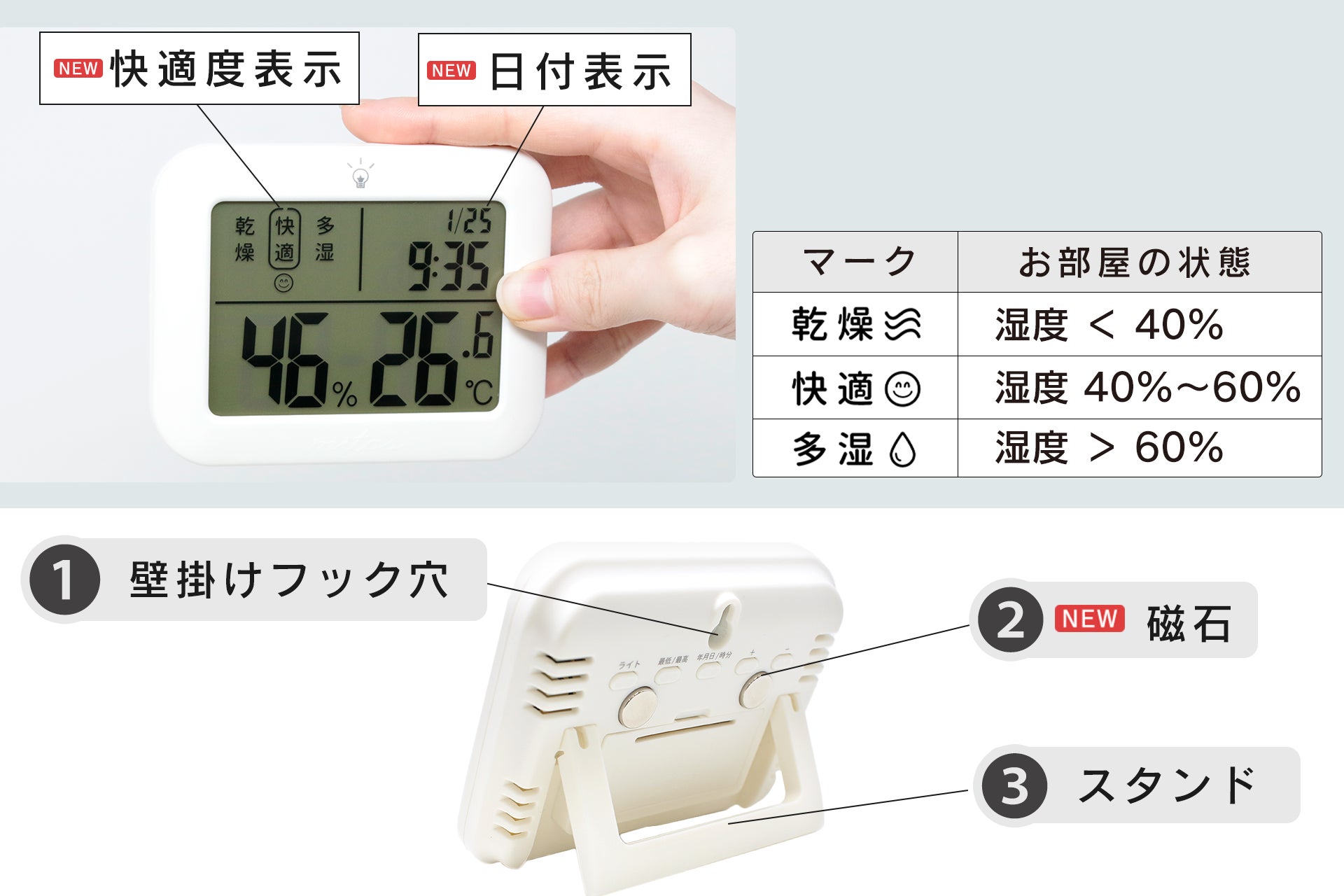 従来の使いやすさに加え、世の中に数多く出回るデジタル温湿度計よりも多機能で使いやすい商品へと生まれ変わります。