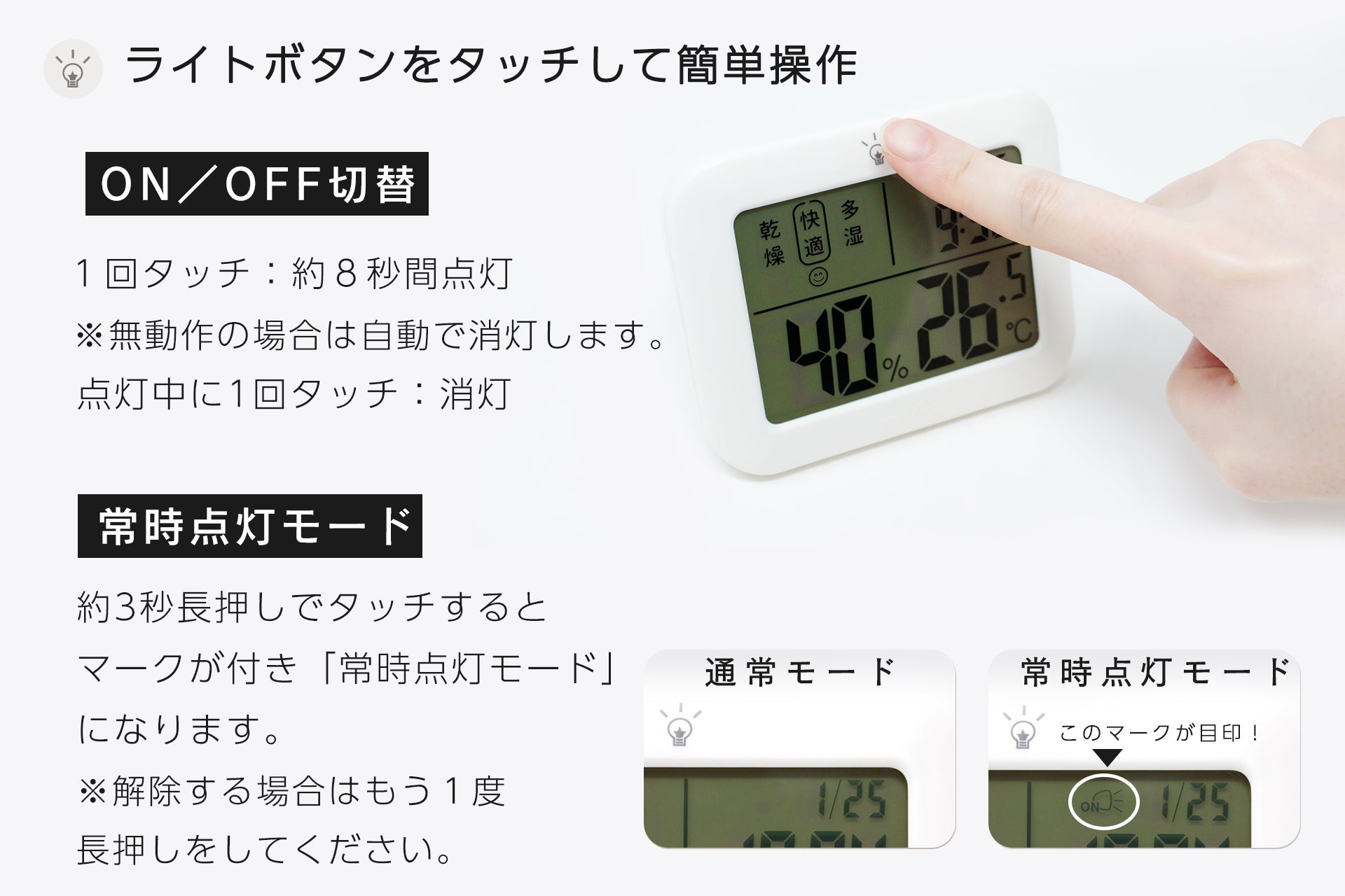 生活をもっと快適に、もっと便利にする「mitasデジタル温湿度計」のリニューアル版。 家庭での日常使いはもちろん、オフィスや学校、さまざまな公共施設での利用にも最適です。
