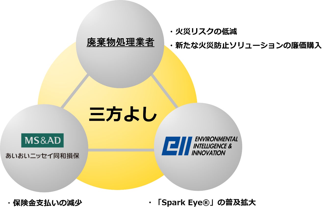 AI火花検知システム「Spark Eye®」の導入により、廃棄物処理業者、あいおいニッセイ同和損保、イーアイアイいずれもメリットがある「三方よし」を実現できます。