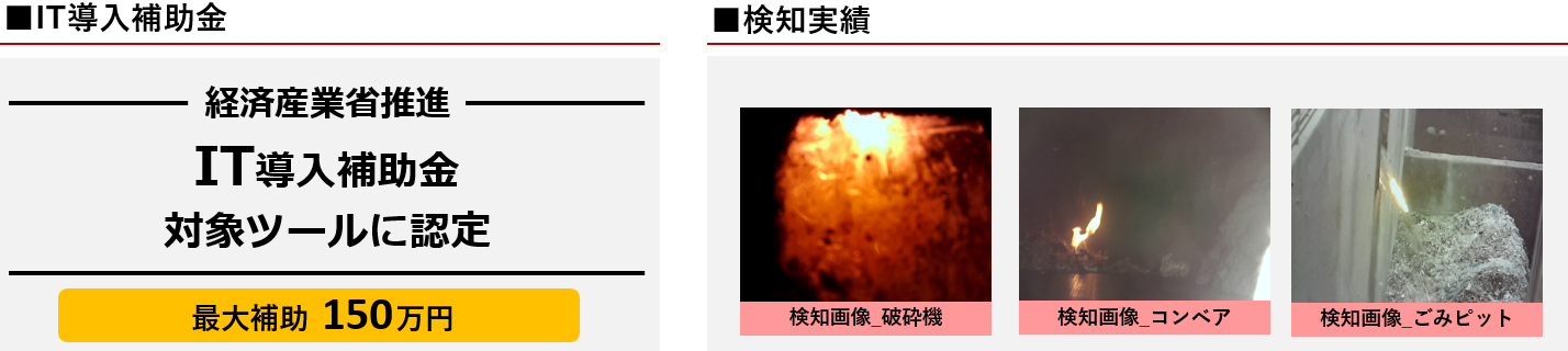 2020年6月以降、既に民間、自治体における多様な廃棄物処理施設を対象に導入実績があり、これまで導入先において火災延焼『ゼロ』実績が得られております。また、経済産業省のIT導入補助金2023の支援ツールに認定されております。