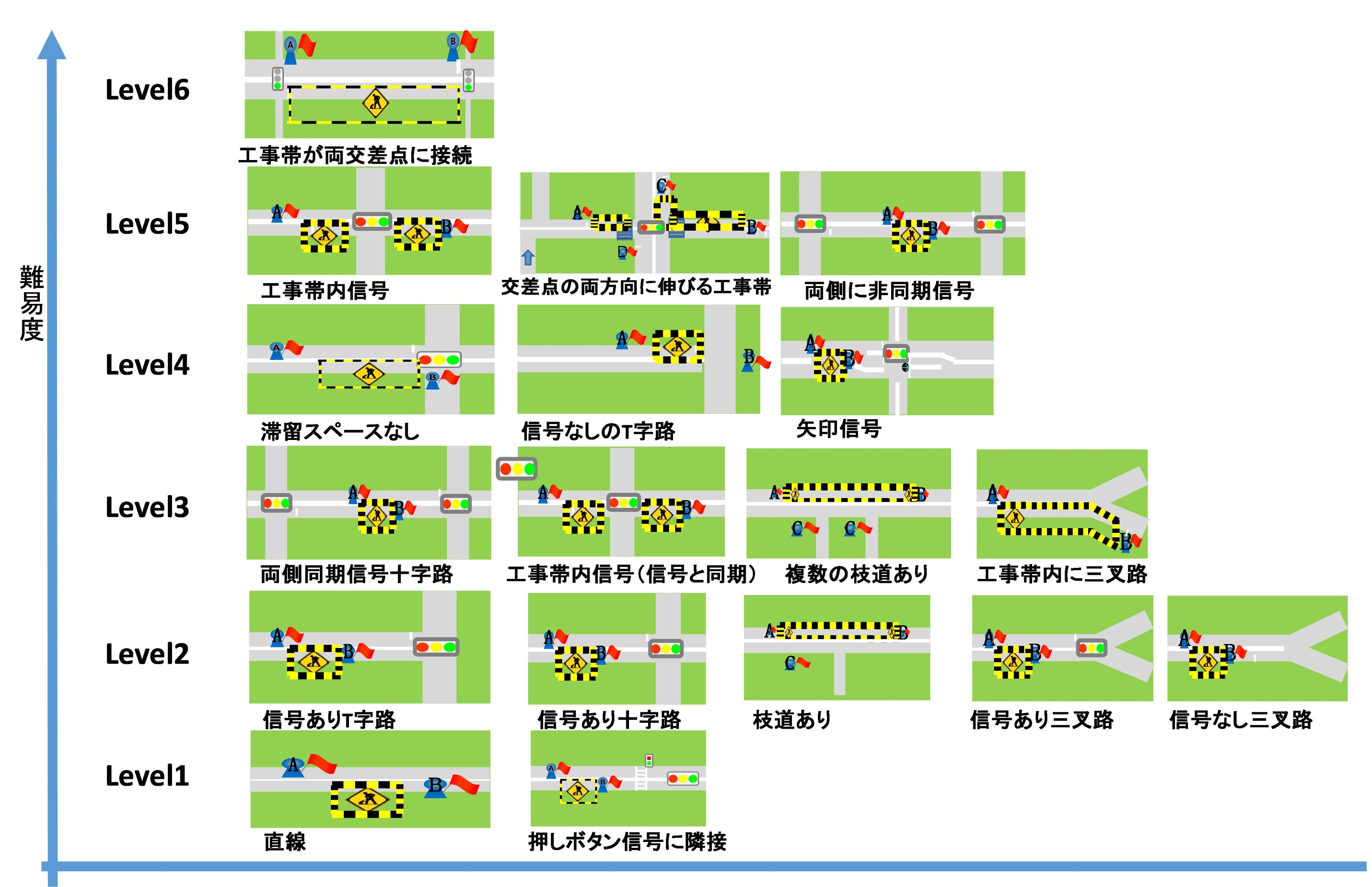 AI交通誘導の実用化を目指して、当社では改めて、車両片側交互通行の現場のパターンを整理し、難易度のレベル分けを行いました。難易度のレベルは、最も難易度の低いLevel1の「直線」「押しボタン信号に隣接」から最も難易度の高いLevel6の「工事帯体が両交差点に接続」までで整理をしています。当社の開発する「Comune+® model-S 2.0アドバンス」では、元より首都圏の難易度の高い現場での利用を想定し、Level2以上の工事帯周辺に信号機がある現場や枝道がある現場に対応できるよう開発を進めてまいりました。今後もより複雑な現場でも対応できるよう、AI交通誘導システムの開発を進めてまいります。