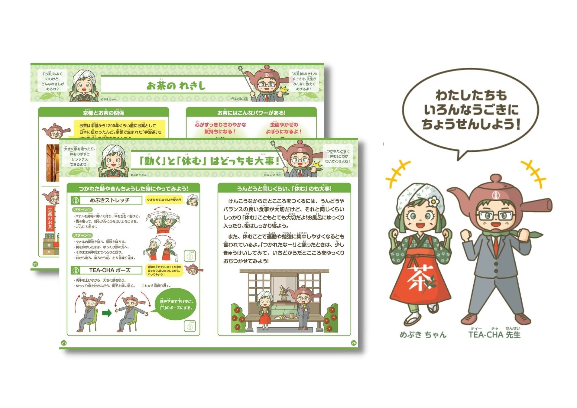 宇治の露製茶株式会社が特別協力する教材には、通常の運動ページに加え、からだと心を「休める」大切さや、お茶の歴史やお茶に関するクイズなども掲載されています。子どもたちが運動と休息のバランスの取れた成長への願いを込めて、開発されました。