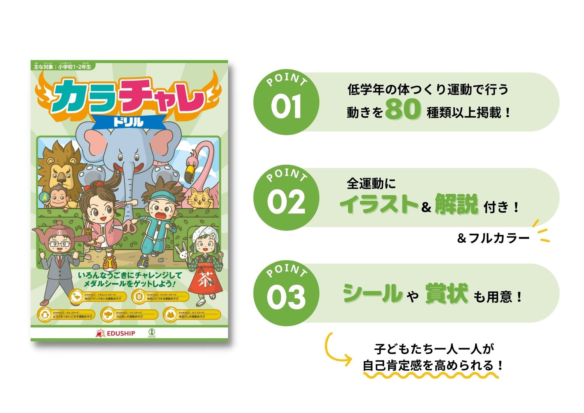 - 一人一冊、日本初の体育ドリル「カラチャレドリル」を提供!