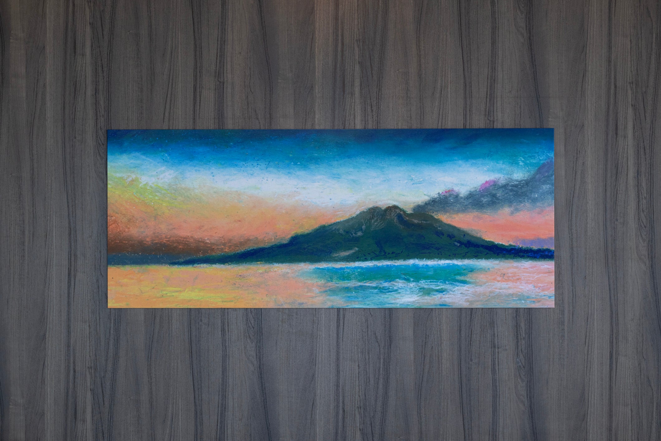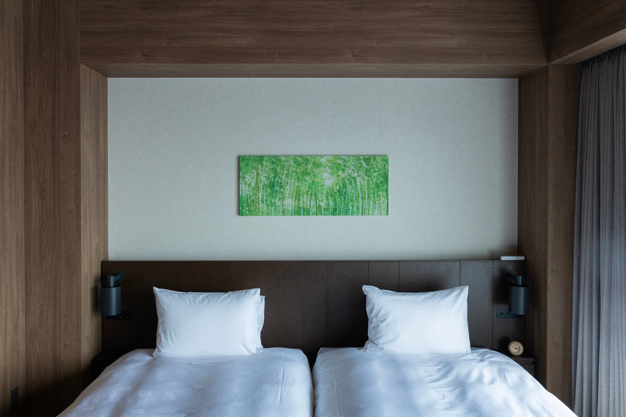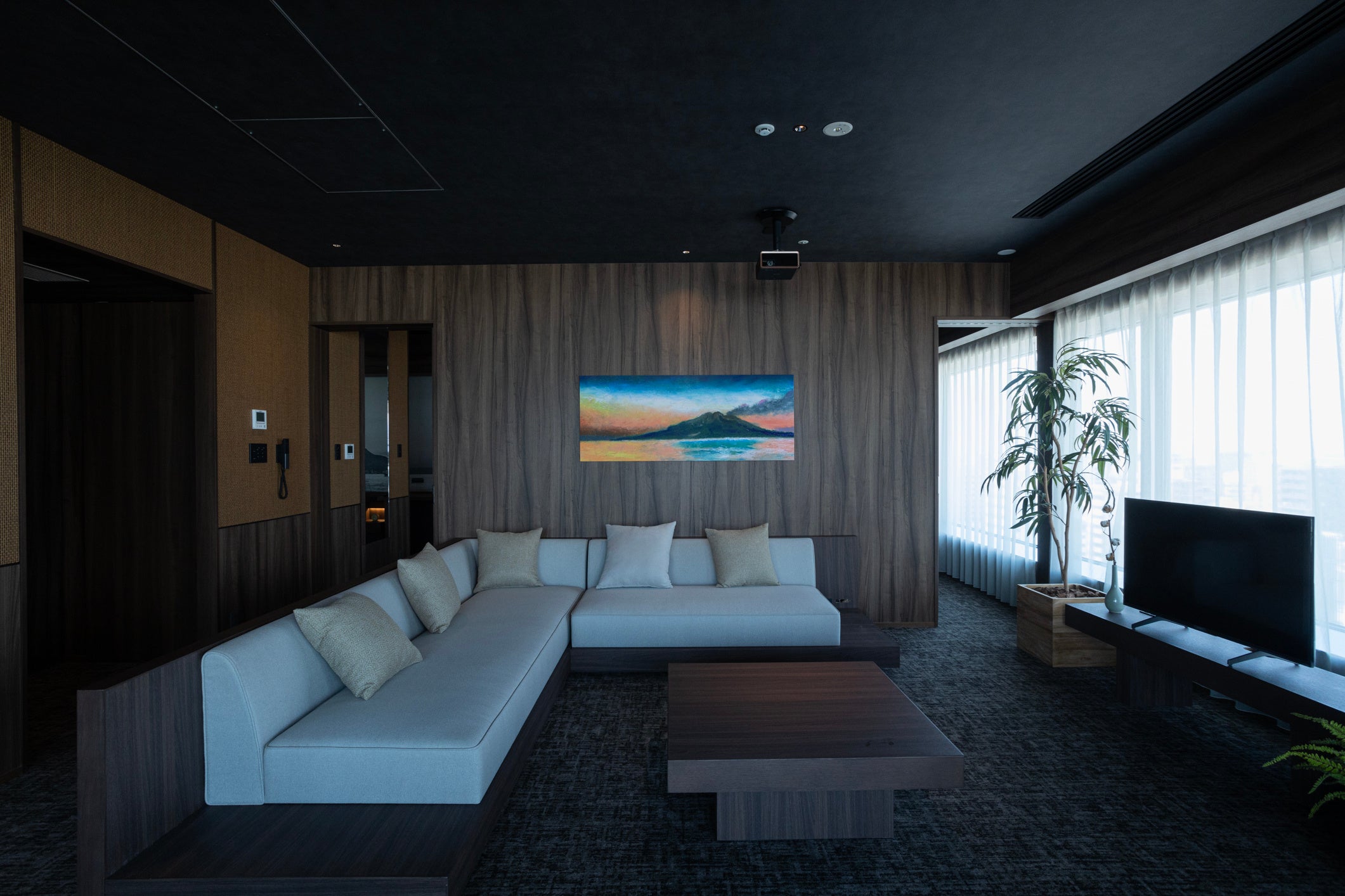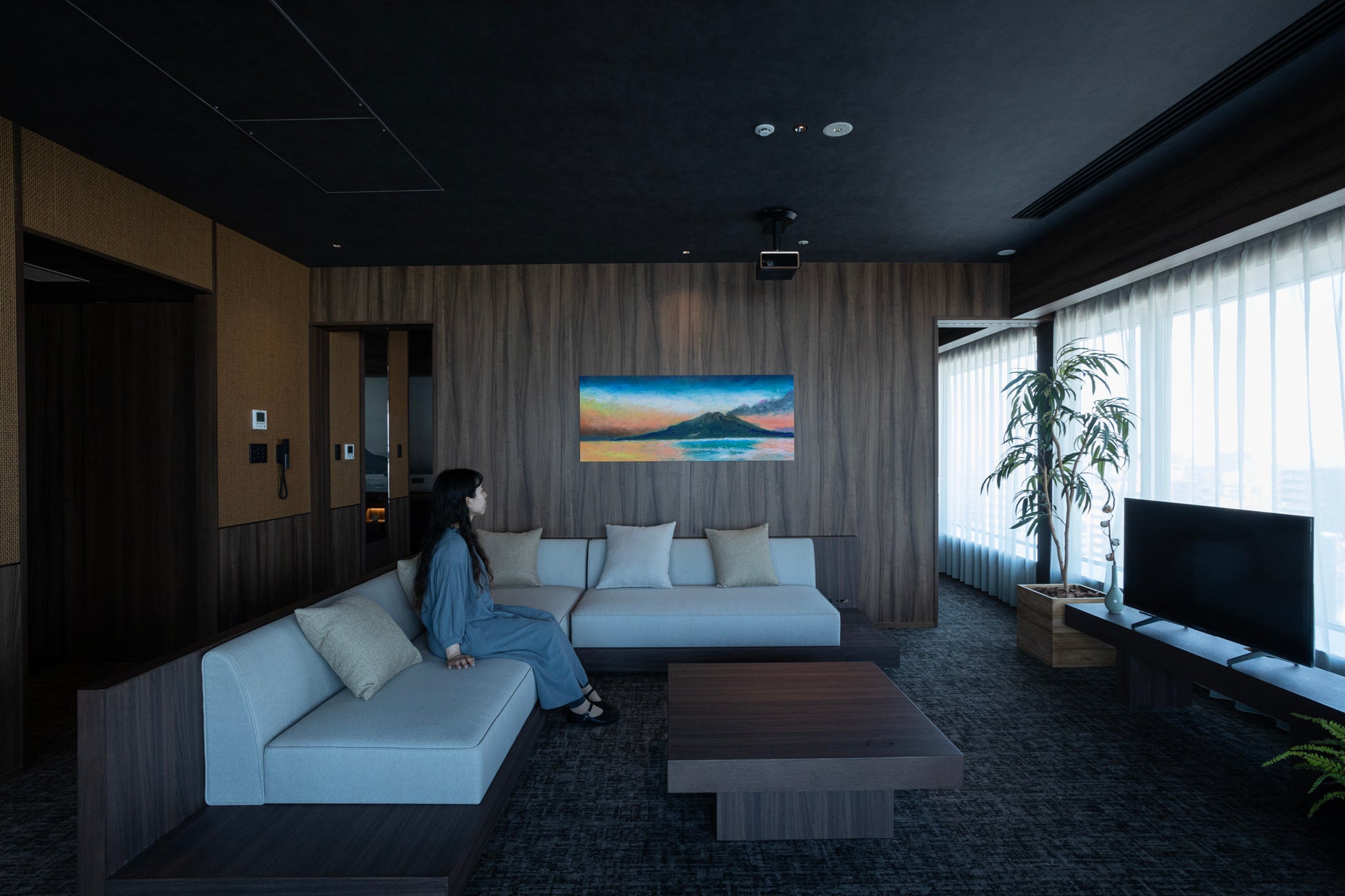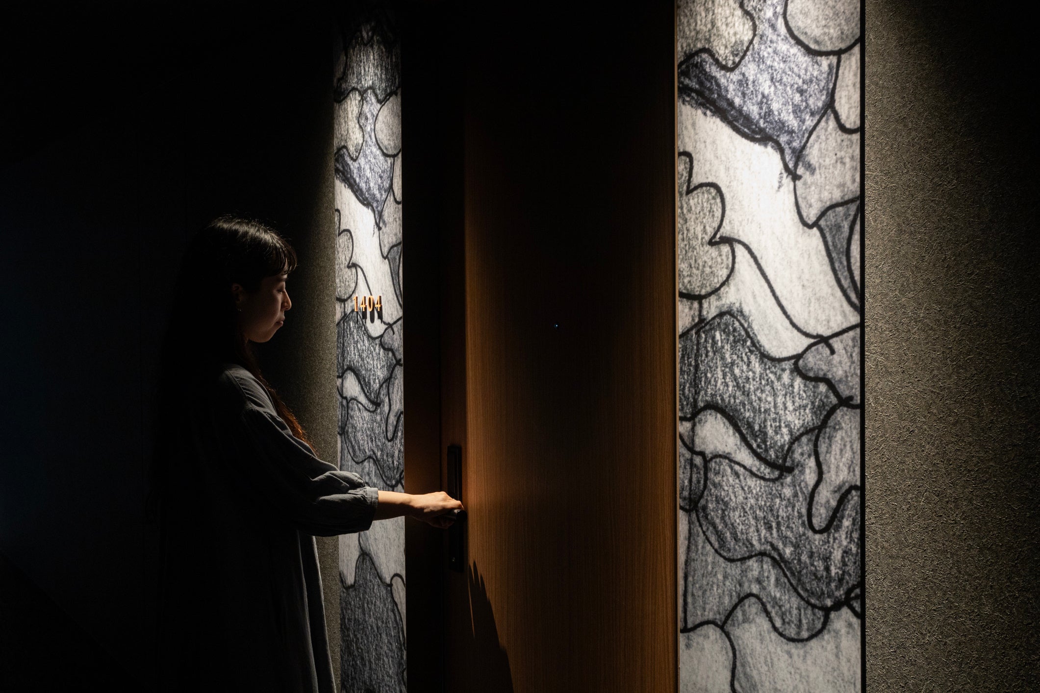 今回、ザ ロイヤルパーク キャンバス 福岡中洲のテーマである【九州の自然に癒される】をキーワードに、2階のラウンジ壁面へ九州の地図をモチーフにしたアートと、4階から14階までの客室壁面へ展示作品10点を制作いたしました。また、客室の扉横には作品をトリミングしたアートパネルが設置されました。