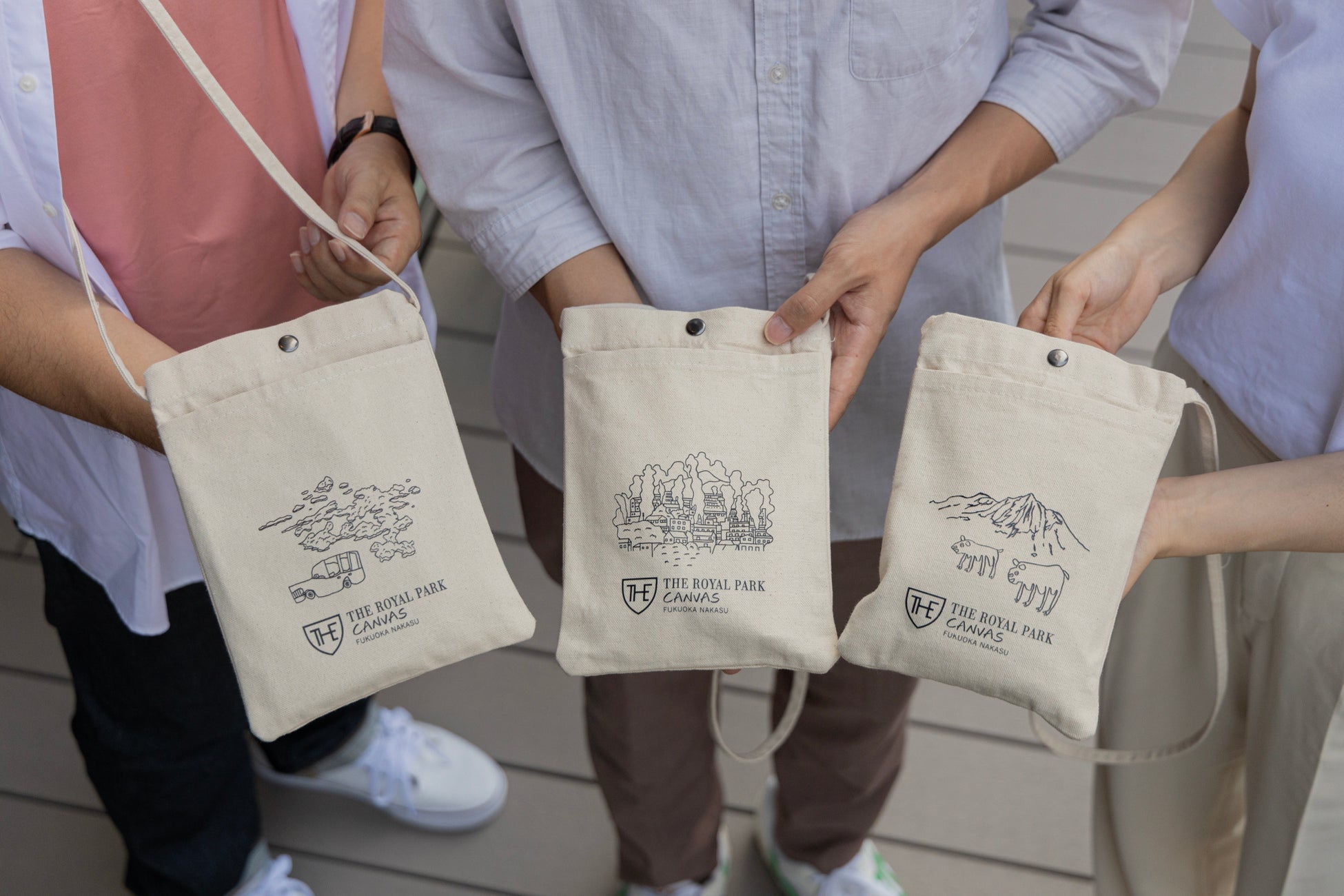 従業員の着用物として、2階ラウンジの壁面アートに起用された九州の地図内のイラストを使用したオリジナルサコッシュを制作しました。デザインは3種類あり、イラストの一部分のみを使用することで興味を惹くようなデザインに。絵の意味を尋ねられた際の、従業員と利用客のコミュニケーションツールとなるようにいう意図も込められています。