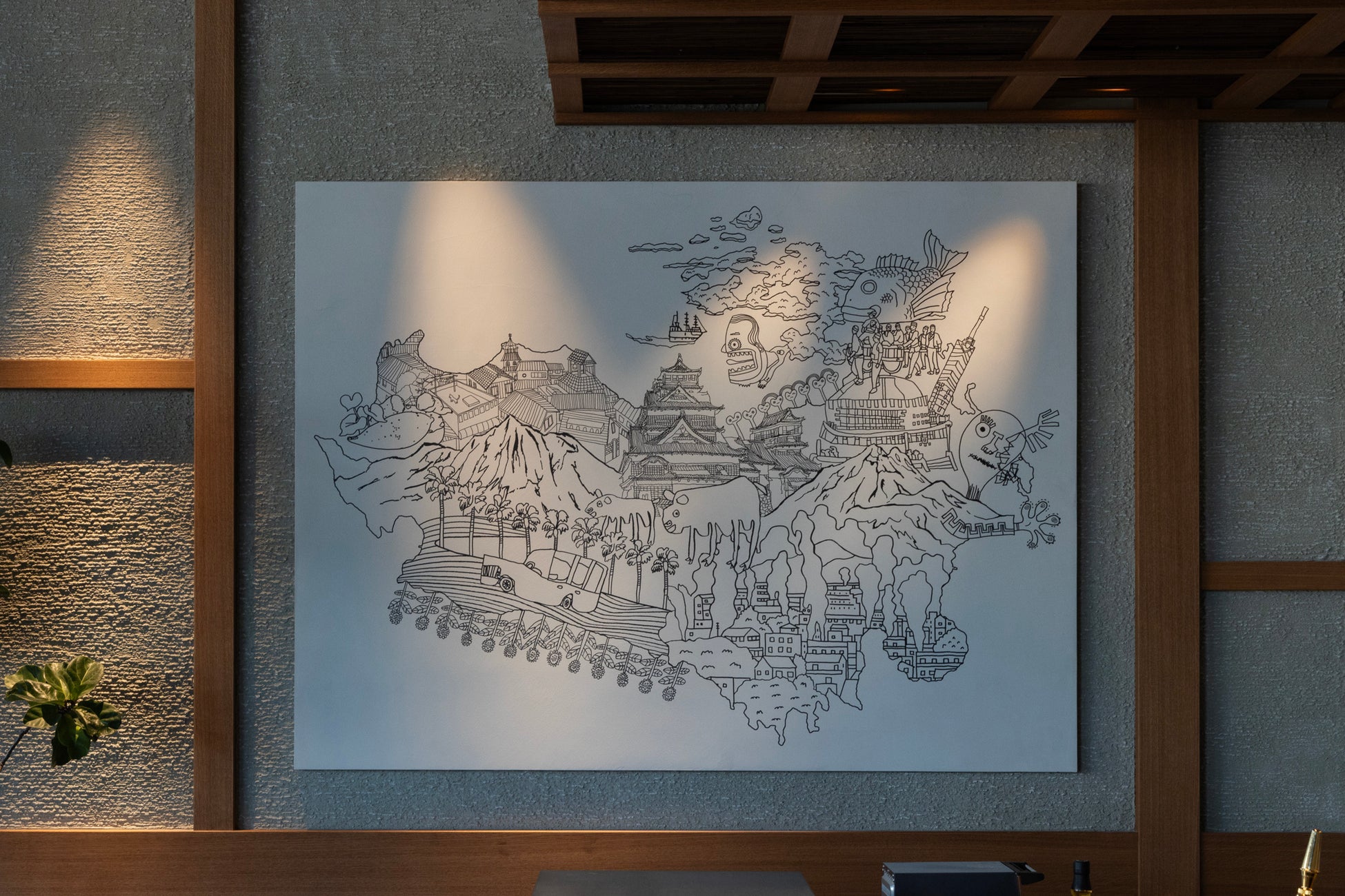 九州の豊かな自然と、各地域の魅力を盛り込んだイラストで九州を表現したアートパネルを2階のラウンジ壁面へ設置。通常の九州のシルエットをあえて横向きにすることで、より目を惹く印象的なアートに。HIBIGEIの契約事業所「工房まる」所属の作家が描いた線画を使用しました。