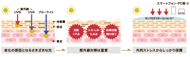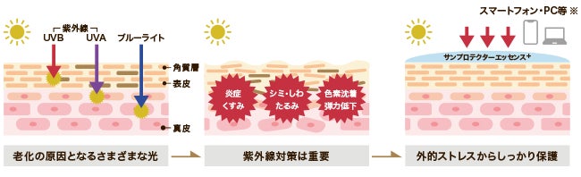 一年中降り注ぐ紫外線を含め、PCやスマートフォンからも発生しているブルーライトによる肌トラブルを防止するため、最適な日焼け止めをお届けしたい。 この想いから、より質の高い日焼け止めを追求するため開発を重ね、新たに追加成分を配合し紫外線・ブルーライトをブロックする日焼け止め美容液としてクオリティアップ致しました。