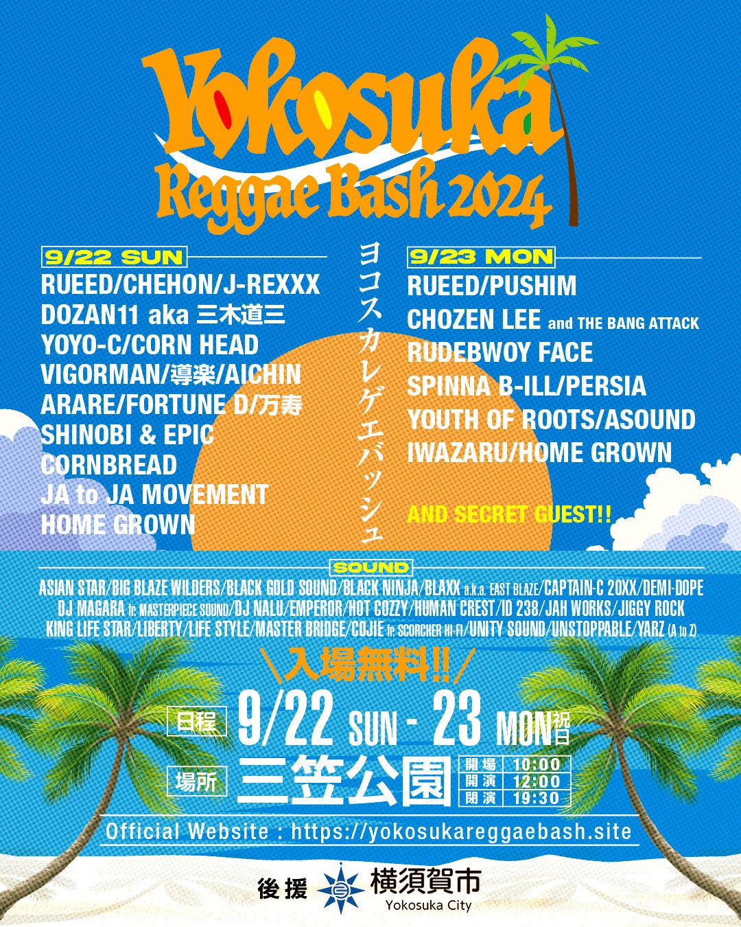 YOKOSUKA REGGAE BASH 2024が9/22(日)、9/23(月・祝)の2日間でなんと今年も入場無料!!豪華ラインナップの全貌も公開!!クラウドファンディングも開始!!