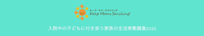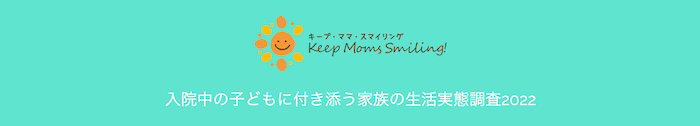 NPO法人キープ・ママ・スマイリング(東京都中央区、理事長:光原ゆき)は、2018年1月~2022年12月の期間において全国の小児病棟で入院していた子どもの付き添いをしている・していた家族(母親・父親など)を対象にインターネットによるアンケート調査「入院中の子どもに付き添う家族の生活実態調査2022」を開始いたしました。