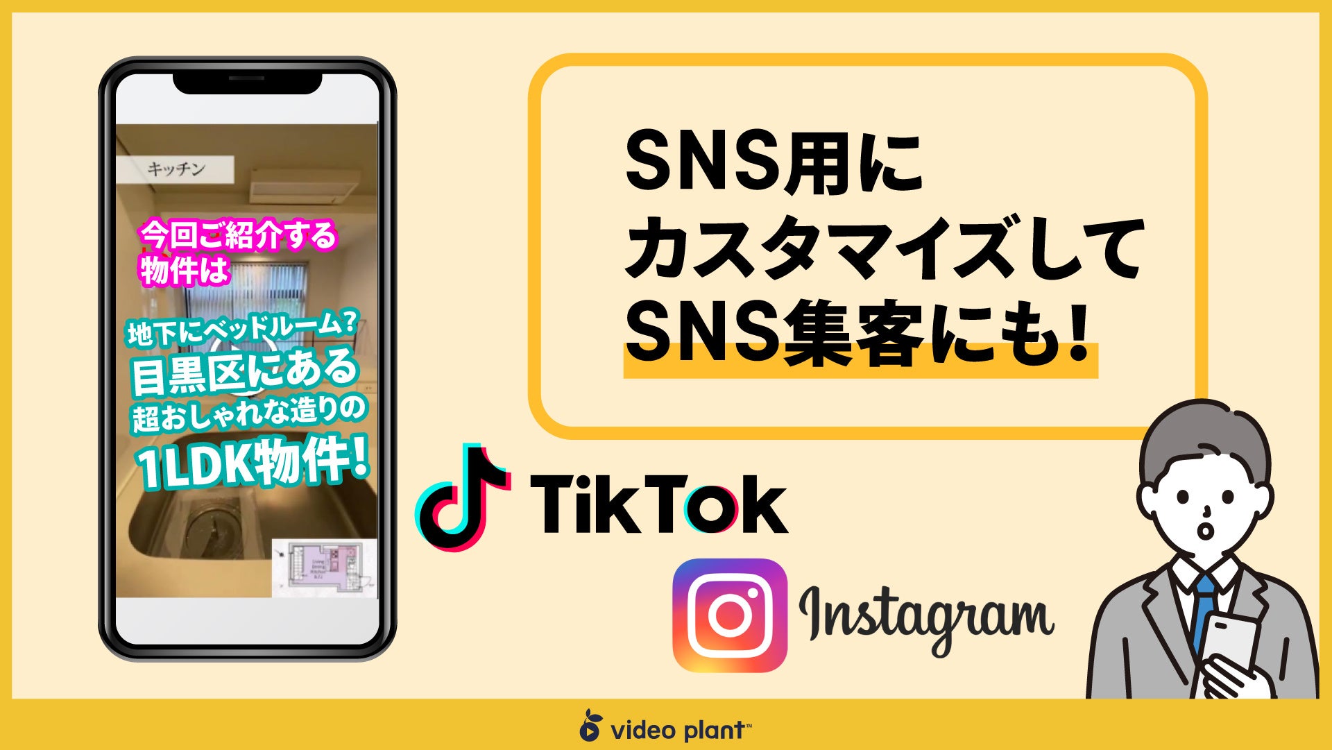 スマートフォンと相性の良い縦型動画を採用。動画のためお部屋の間取りや、大きさをより分かりやすく伝えられます。360度カメラで撮影された情報と比べると、ハンズフリーで視聴が可能となり、コンシューマーの物件の視聴体験の向上が期待されます。ポータルサイトやアプリはもちろん、SNSにも投稿しやすいコンテンツで発信力強化も期待できます。