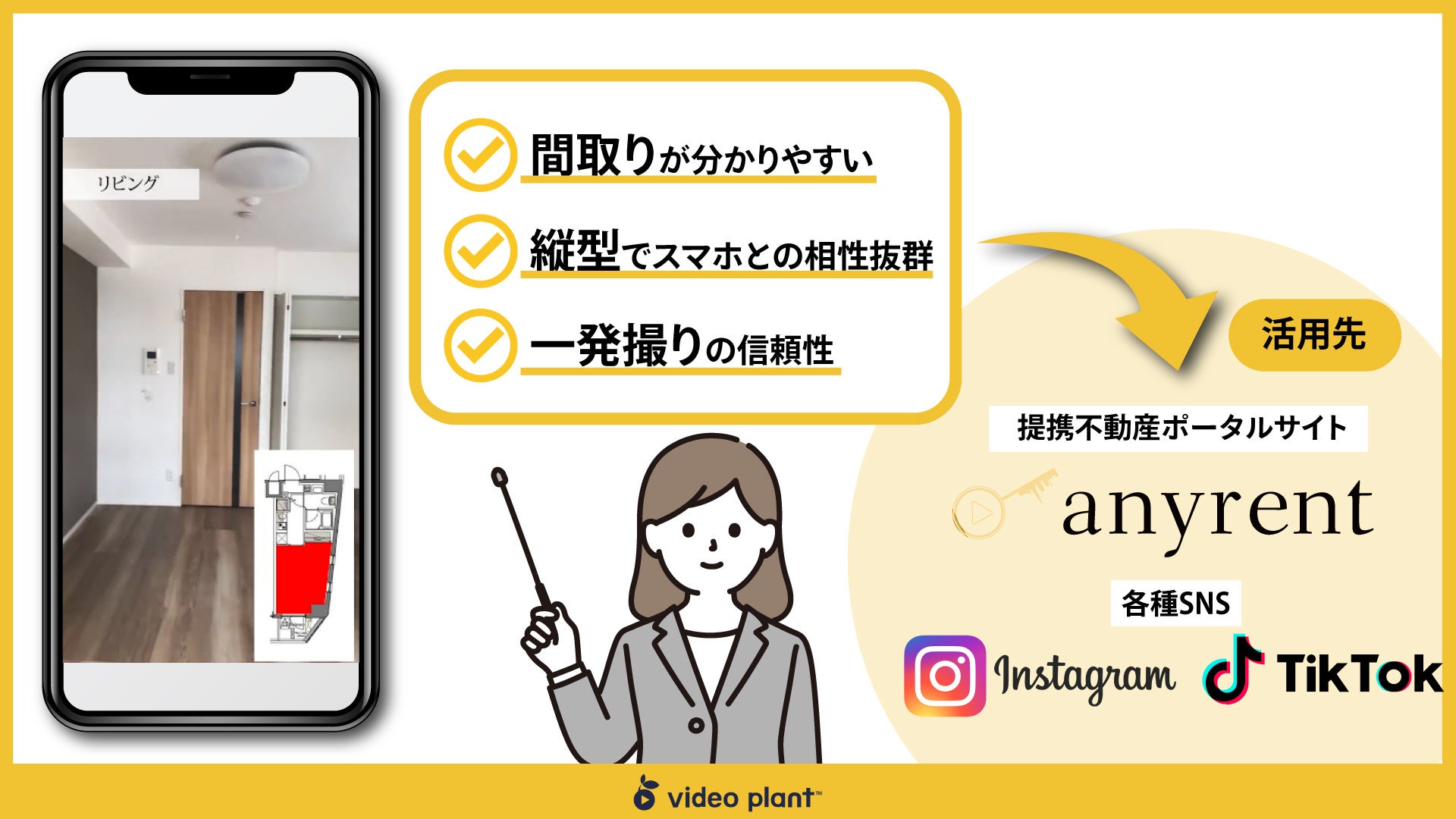 縦型の「ルームツアー動画」で内覧業務を効率化!信頼度の高いお部屋情報で、不動産会社の物件確認をサポート。