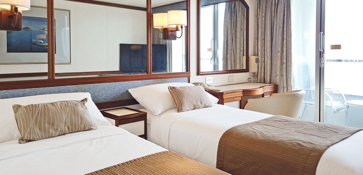 船内生活の中でいつでも海を近くに感じられるよう、船室は海側に面した窓付きのタイプを豊富に備えています。そのうち7割にのぼる410室がバルコニー付き。ラグジュアリーなスイートルームから機能的にまとまったリーズナブルな船室まで、上質なプライベート空間をご提供します。
