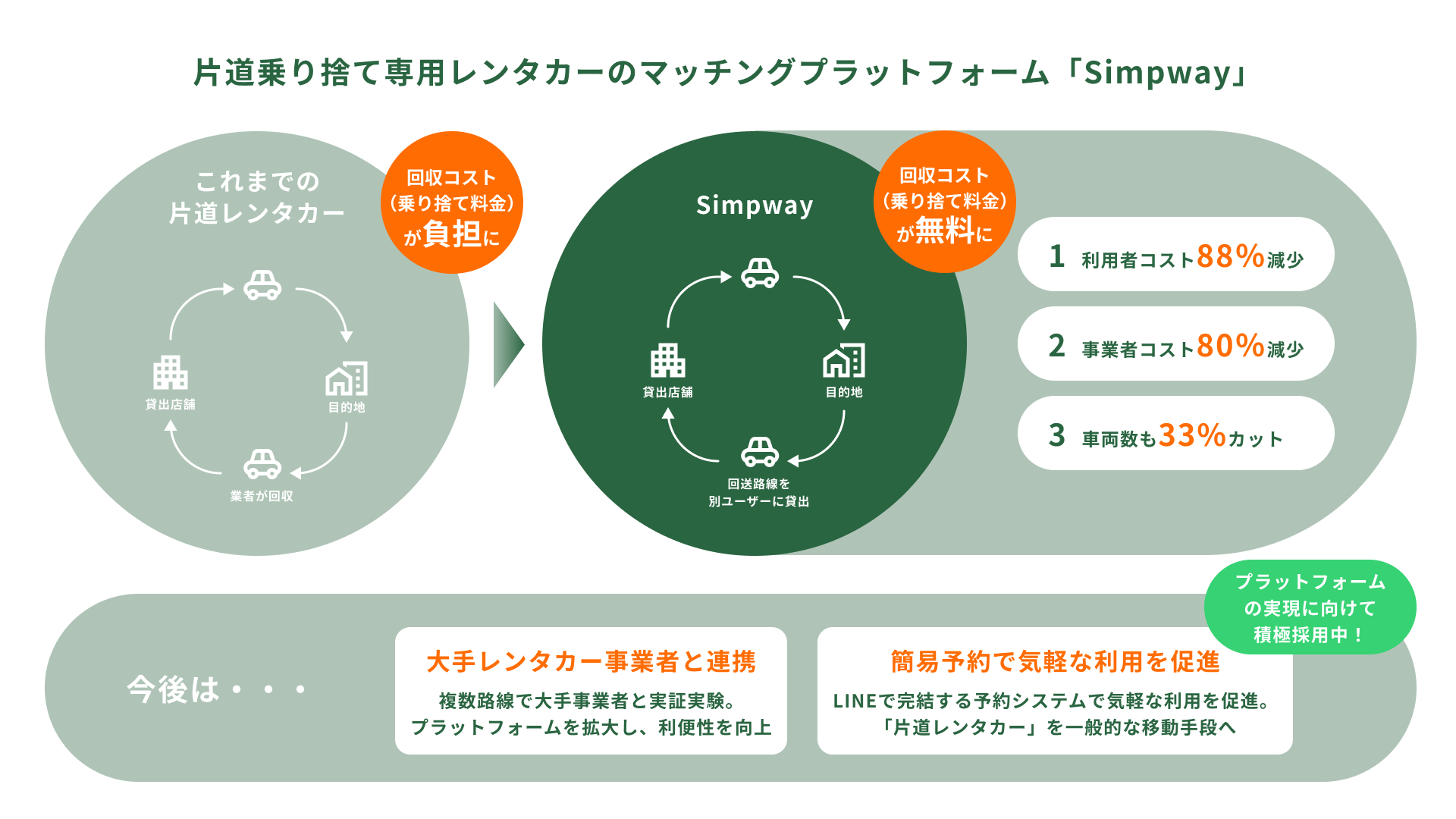 これらの課題を解決するため、パスファインダーは、最適配置アルゴリズムを利用し、片道乗り捨てレンタカーの上り利用のユーザーと下り利用のユーザーをマッチングさせることで回送料金を発生させない「片道乗り捨て専用レンタカーの回送アウトレットプラットフォーム― Simpway(シンプウェイ/以下、シンプウェイ)」を運営しています。また、データ取得とオペレーションやニーズ検証等を目的に、自社でもレンタカー事業者として片道乗り捨てレンタカーを展開しています。