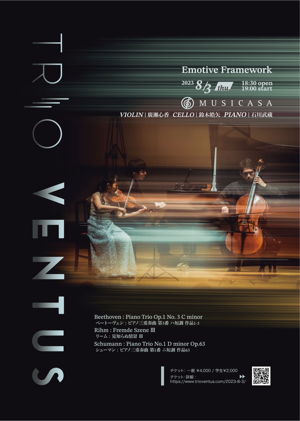 「Emotive Framework - 情動的な構造」というタイトルは、豊かな音楽の世界に魅了される体験を目指して名付けられました。TRIO VENTUSは今回の心に深い感動を呼び起こす音楽を探求し、その美しさと情熱を共有することを目指しています。