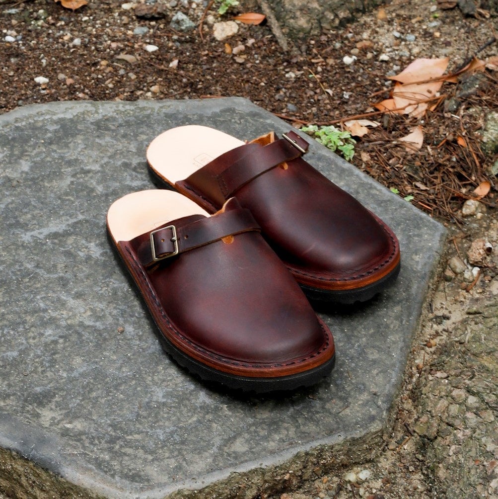 自然でしっとりした表情の革でつくったサンダルです。甲のストラップでフィットを調整することができます。甲のなだらかな曲線が、奈良と京都の県境に横たわる平城山(ならやま)丘陵にも似ているので「ならやまサンダル」と名付けました。レザーは、植物タンニンでなめし、丘染めした後、手作業で何度も蝋を塗り込んで仕上げた「たつのハンドワックスレザー」。KOTOKAの依頼で開発され、兵庫県たつの市で仕上げられています。