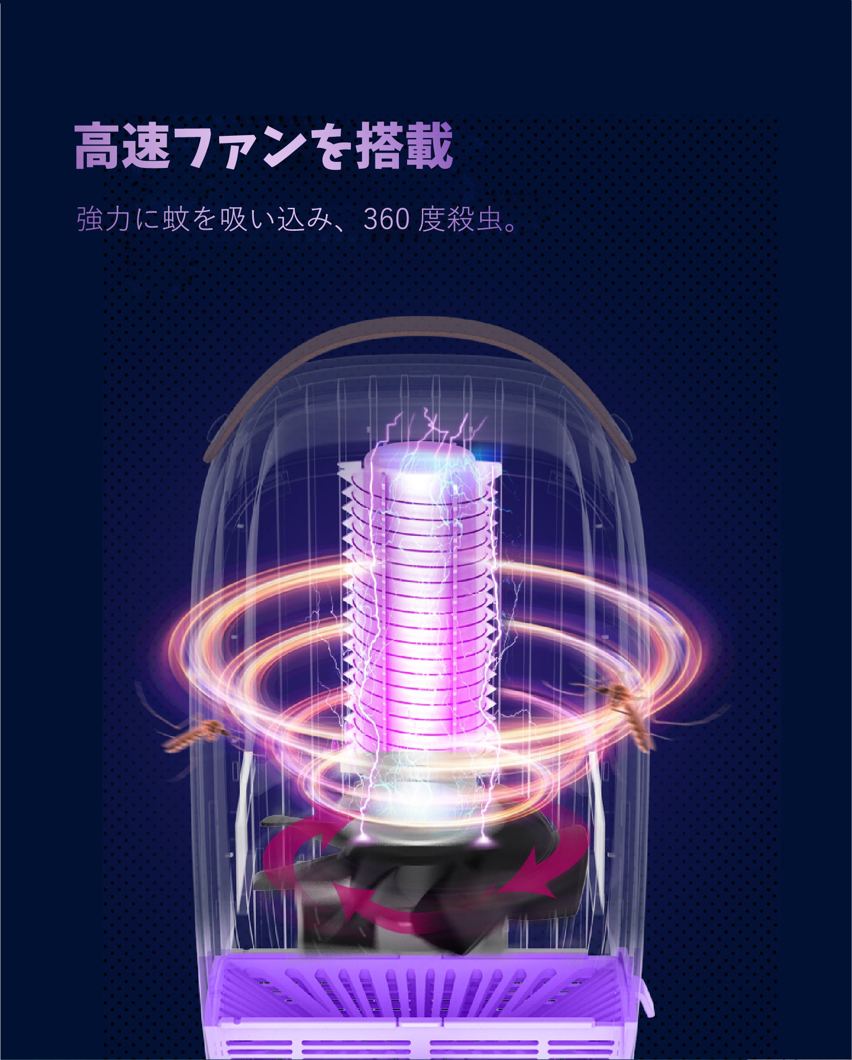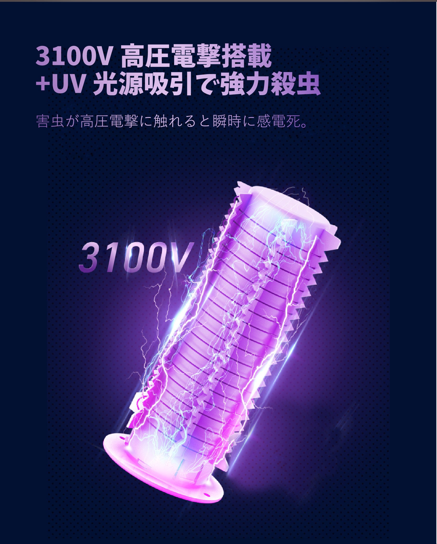 - 3100V高圧電撃+UV光源+吸引効果で蚊を撃退。