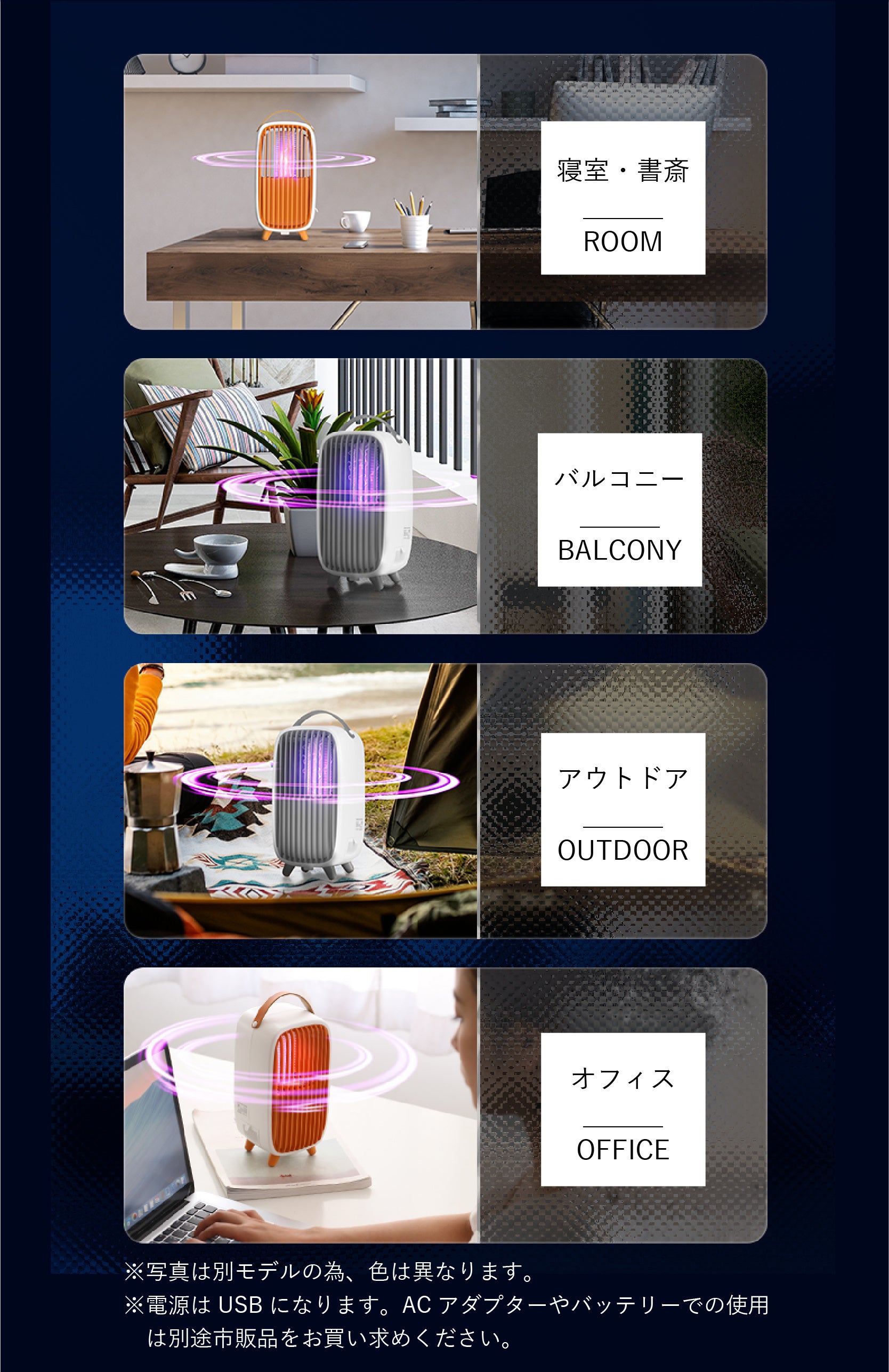 USB電源で動作しお部屋ではもちろんですが、別市販モバイルバッテリー等でキャンプ・アウトドアでのご使用も可能です。