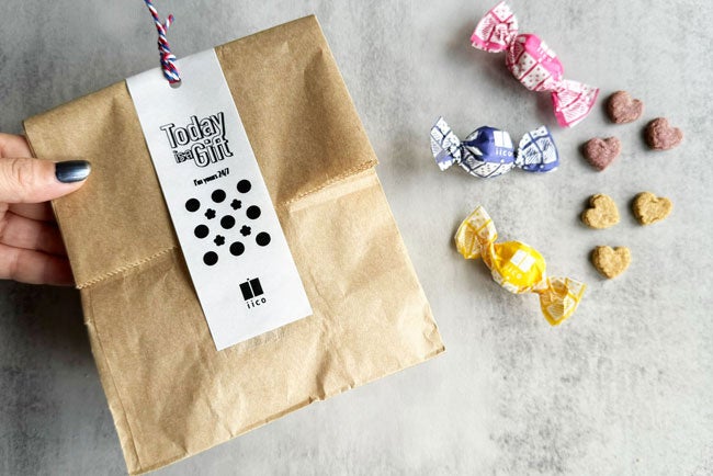 小粒のハートクッキーと、そのクッキーを3粒で1包みにラッピングしたキャンディ包みはiicoのシグネチャーアイテム。それらがギュッと入ったリフィルは、お悔み用だけでなく今を生きる愛犬へのメッセージにも通じて、より多くのギフトシーンで利用が可能。