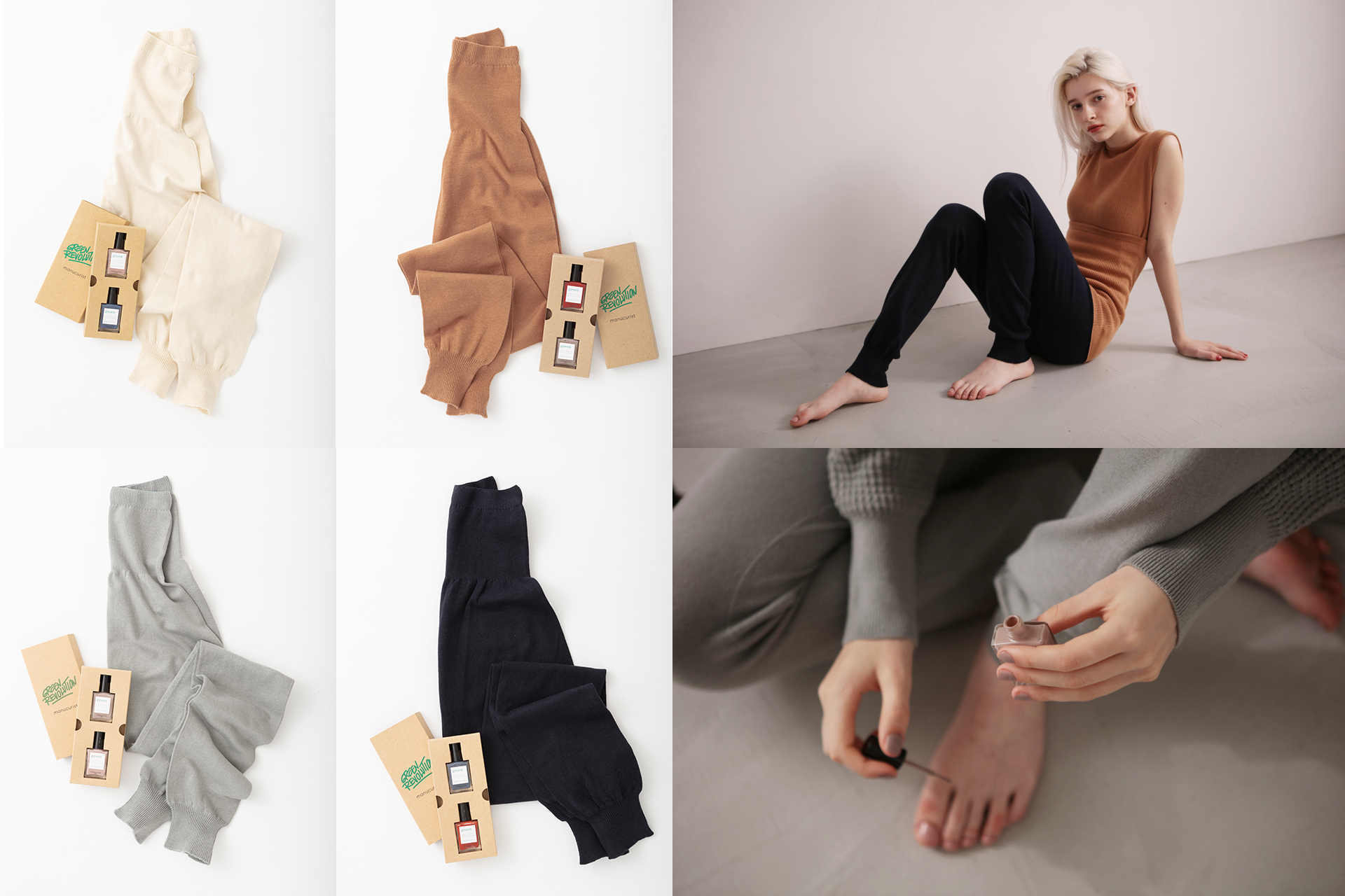 ふんわり柔らかいカシミヤのような肌触りで、腰から足首までしっかり下半身あたためてくれるハラマキ付きレギンスとマニキュリスト《green》のネイルポリッシュが2本付いたスペシャルセット。