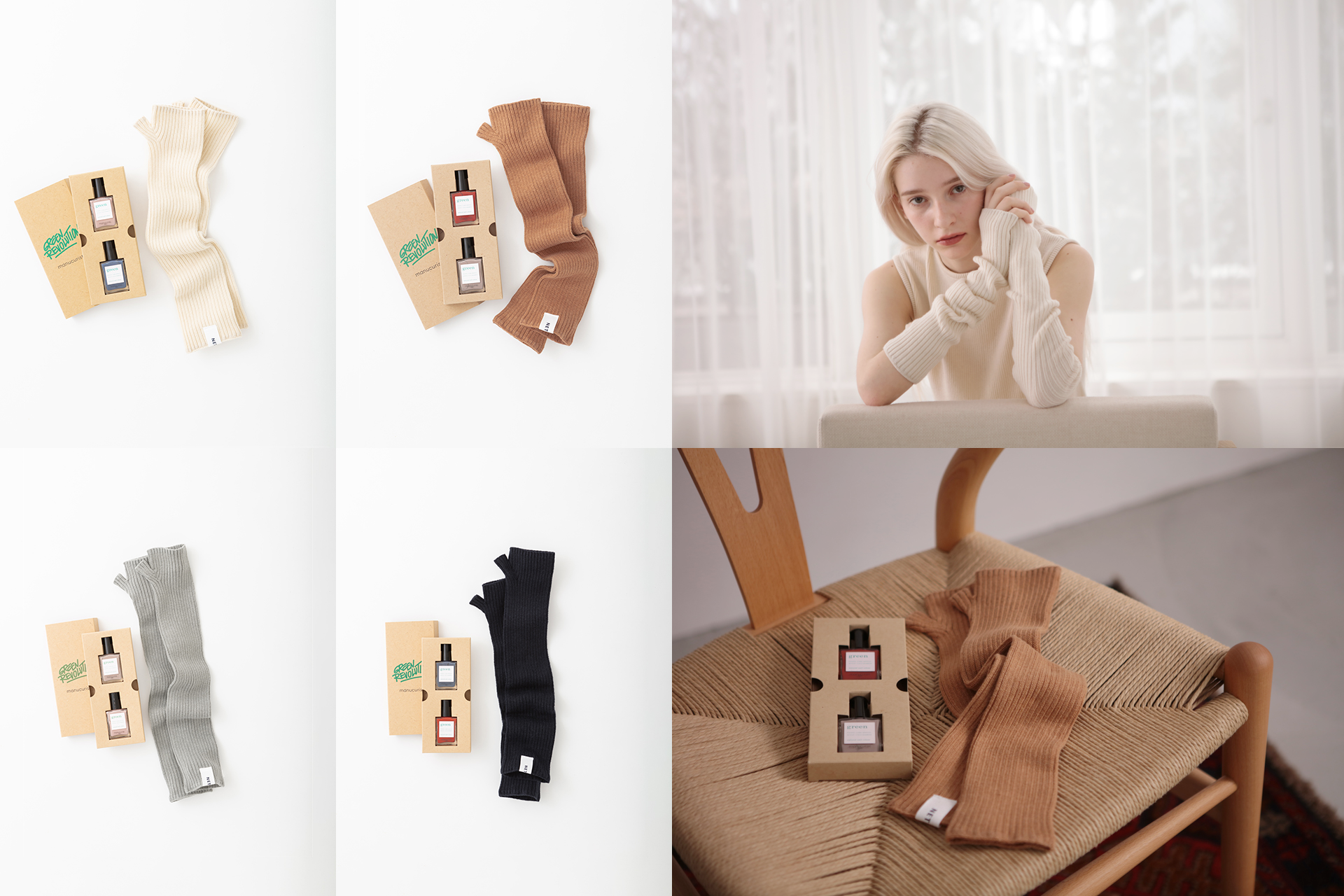 カシミヤのように柔らかく軽いネテネのアームウォーマーとマニキュリスト《green》のネイルポリッシュ2本のスペシャルセット。