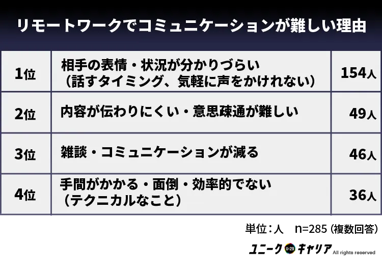 「円滑なコミュニケーションが取りづらい」「意思の疎通が難しい」など、リモートワークではコミュニケーションを取るのが難しいため、管理しづらいと感じる人が多いと考えられる。