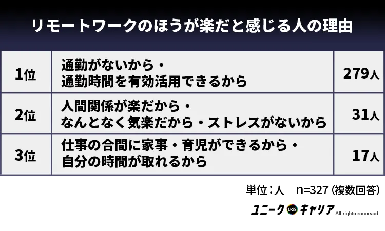 「リモートワークのほうが楽」と感じる人の理由は表のようになった。