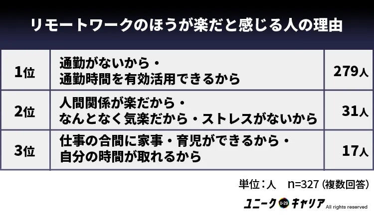 また、「職場で愚痴を聞かなくてよいから」のような、人間関係にストレスを感じている人にとっては、リモートワークが楽と感じるようだ。