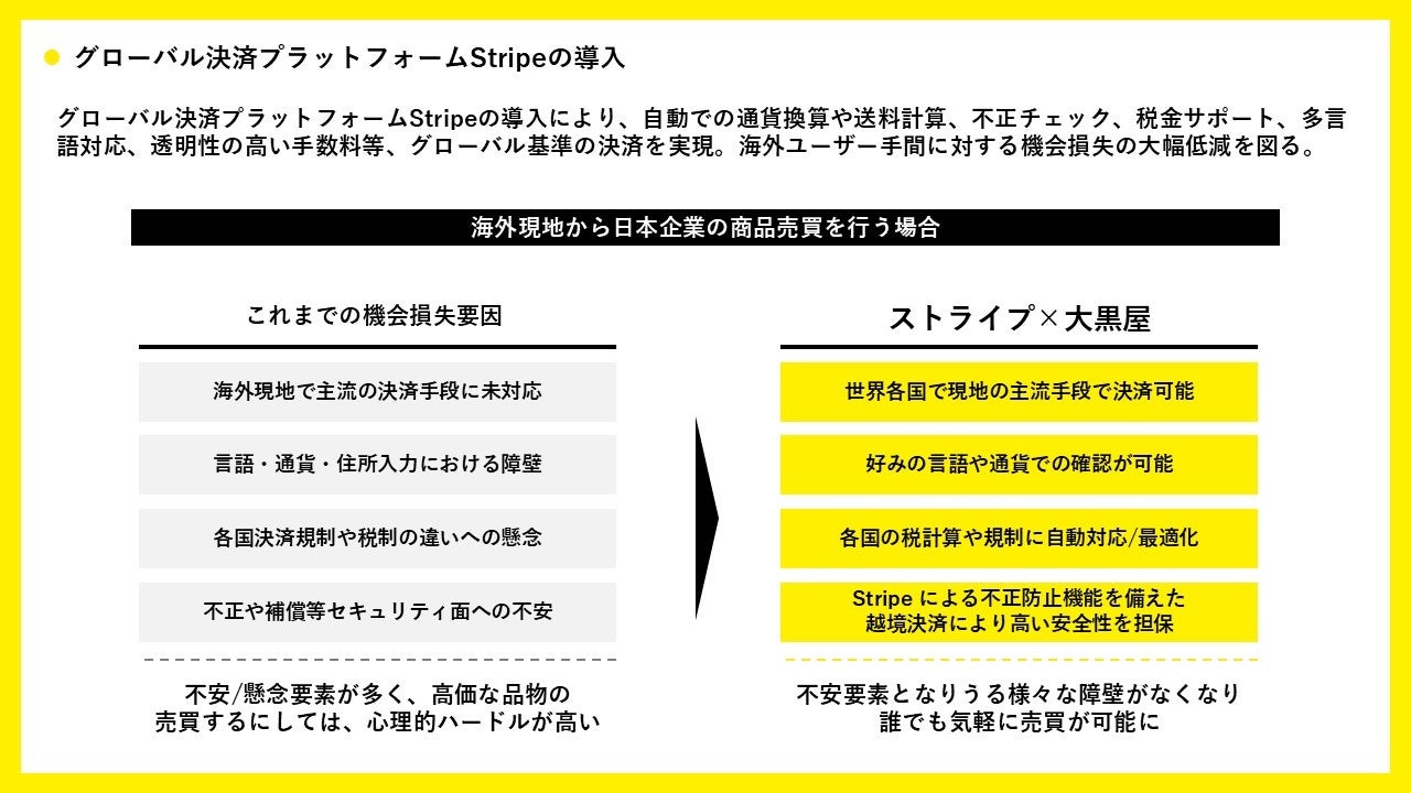 株式会社大黒屋(本社:東京都港区、代表取締役社長:小川浩平)は、6月20日(金)より、グローバル決済プラットフォームである「Stripe」を導入し、新たにグローバル市場の開拓に着手します。