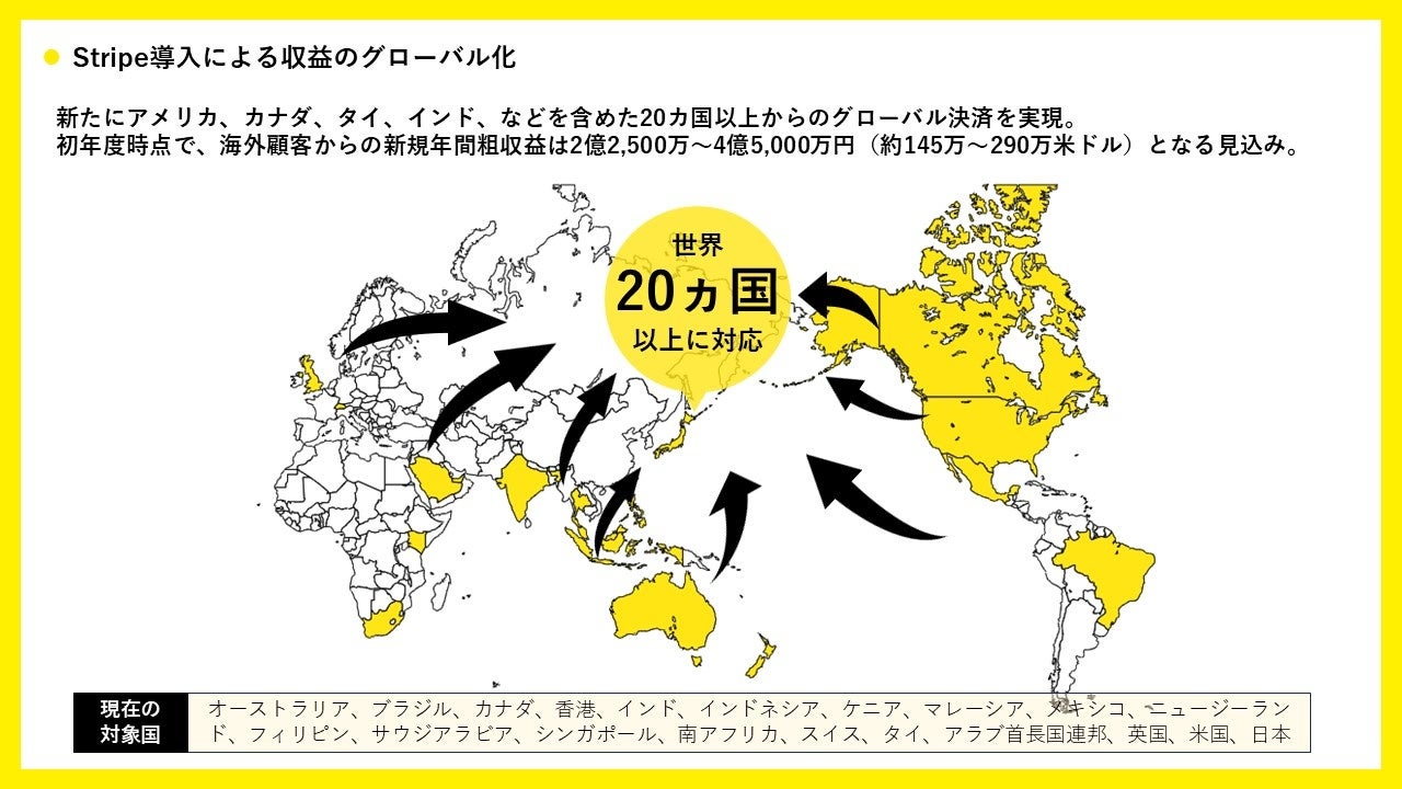 具体的には新たにオーストラリア、ブラジル、カナダ、香港、インド、インドネシア、ケニア、マレーシア、メキシコ、ニュージーランド、フィリピン、サウジアラビア、シンガポール、南アフリカ、スイス、タイ、アラブ首長国連邦、英国、米国、日本などを含めた20カ国以上からのグローバル販売を実現することを目指します。