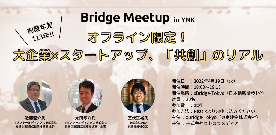 株式会社QED(東京都中央区、代表取締役:室伏正裕)とキリンホールディングス株式会社(東京都中野区、代表取締役社長:磯崎功典)は、東京建物株式会社(東京都中央区、代表取締役 社長執行役員:野村均)が主催する、スタートアップ×大企業の共創事例のリアルを話すイベント『xBridge Meetup in YNK』に登壇します。