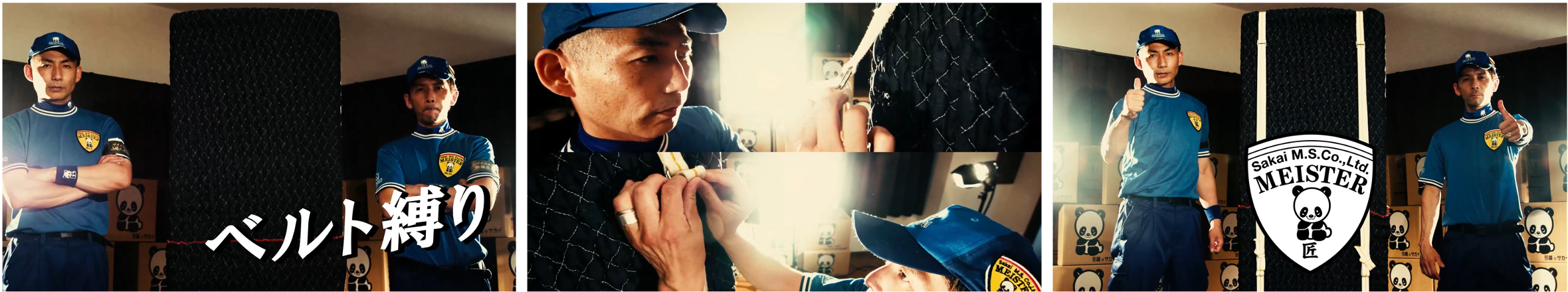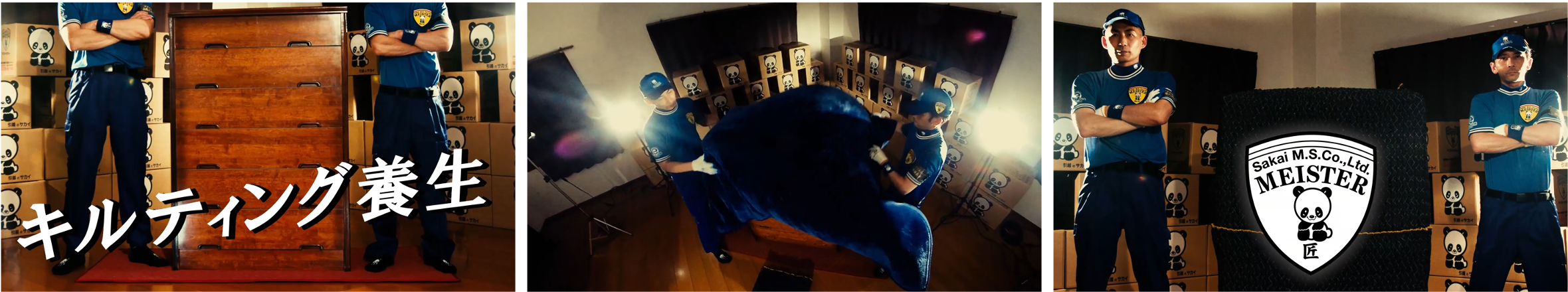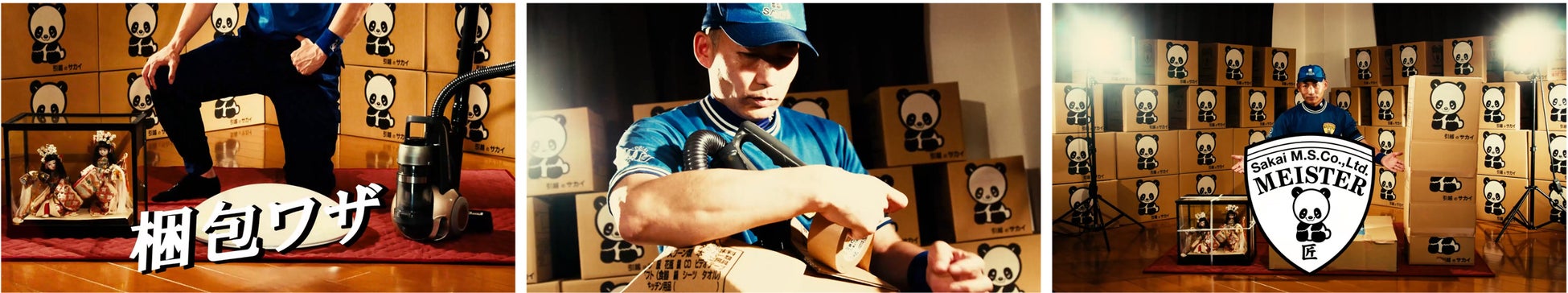 先輩・板橋駿谷さん、桃月なしこさん、まごころパンダくんの3人が引越のプロ「マイスター」を目指して奮闘する新CM。新CMの公開に合わせて、現役の「マイスター」が引越のスゴ技を披露するWEB動画「サカイマイスター スゴ技ムービー」(「キルティング」篇 / 「ベルト縛り」篇 / 「特殊梱包」篇)を同日公開いたします。