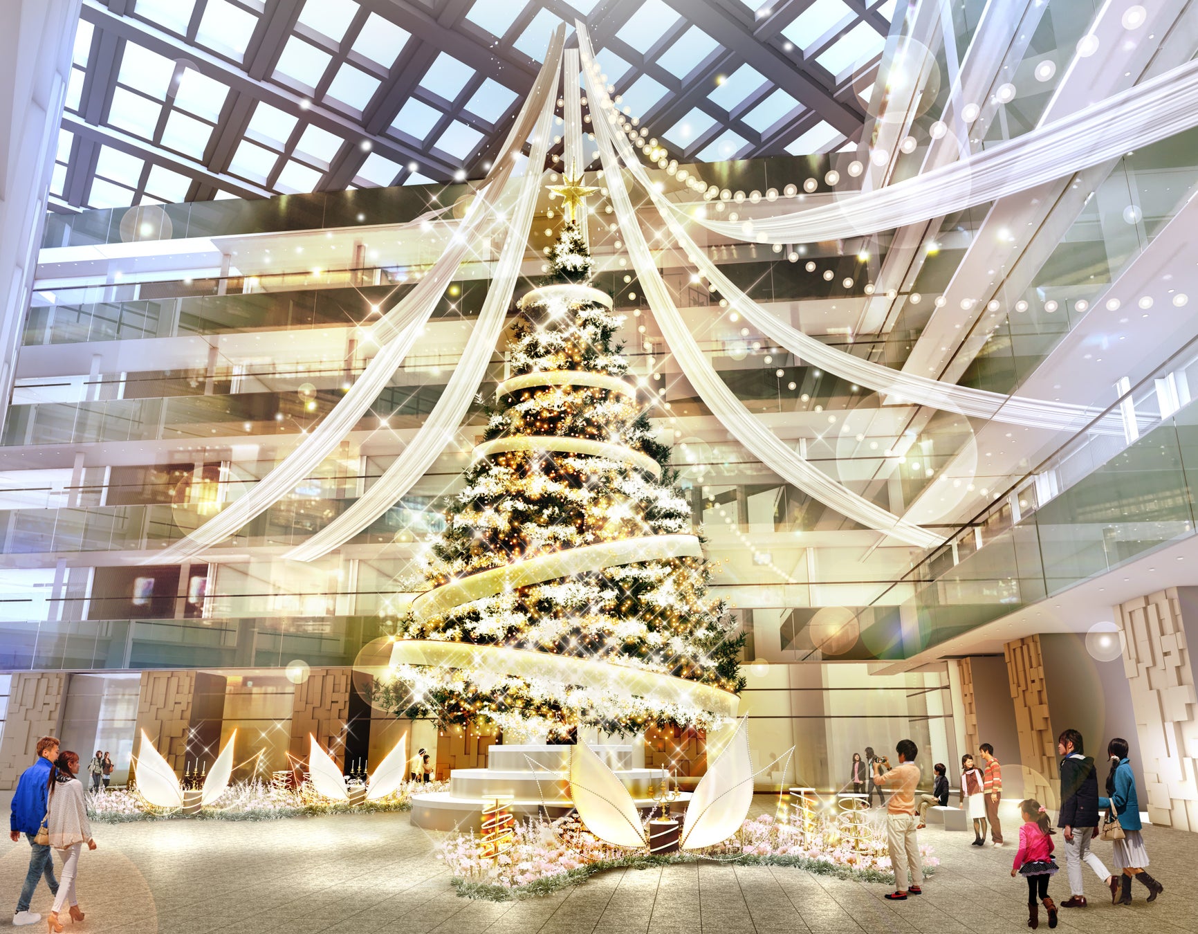 開催期間中、1階アトリウムには、本物のモミの木を使用した全長約13.5mのメインツリー「ブリーズツリー」が出現。約3万球ものLEDを纏って、煌びやかに光り輝きます。また、ツリーを覆うように広がるのは、リボンをモチーフにした全長約100mの純白のベール。天井よりアトリウム全体を包み込み、温もり溢れる空間を演出します。
