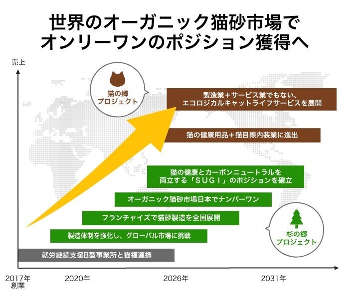 多くの人手を要するオーガニック猫砂の作業現場では、障がいをお持ちの方々が主役として生き生きと働くことを実現しています。就労継続支援B型事業所との提携(FC契約)により、猫の福祉と人の福祉を連携して猫福連携を推進します。猫の一時預かりや猫の介護などのエコロジカルキャットライフケアサービス事業(自然、猫、人間の共生生活事業)に進出し、環境への貢献と猫の福祉、人の福祉を向上する事業を展開します。