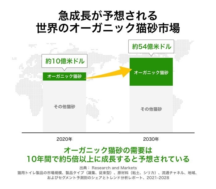 現在、全世界で6億3000万匹の猫が人と共に暮らしており、この市場は拡大傾向にあります。素材の安全性への懸念からオーガニック猫砂への注目も高まっています。