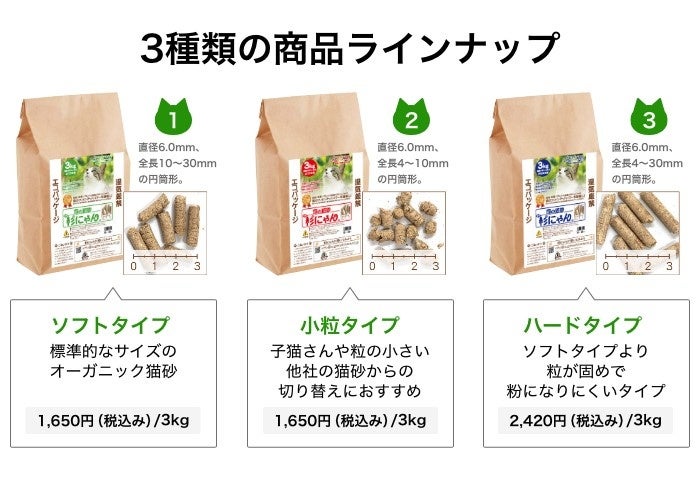 また、本クラウドファンディングにご投資いただいた方だけの特典として、株数(投資金額)に関わらず2022年2月末までに、「命の猫砂 杉にゃん」お試し1kg×三種セットを1セット贈呈させていただきます。
