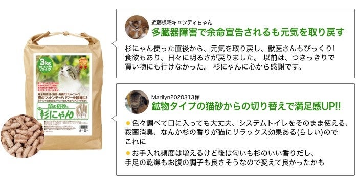 『命の猫砂 杉にゃん』は、特許技術による製法で杉の有効成分を存分に活かした消臭効果と安全性でユーザーからの支持が高い商品です。