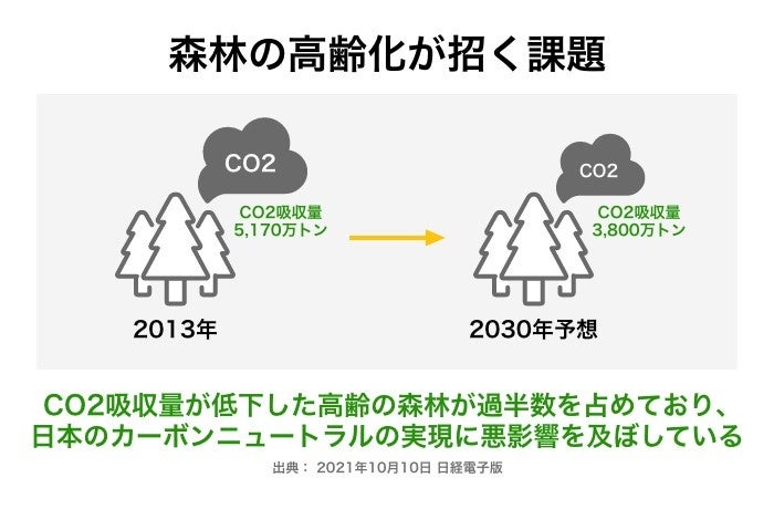 日本の森林では、需要低下によって伐採されなくなり高齢化した杉が問題になっています。高齢化した杉は、CO2吸収力がどんどん低下していきます。こうした高齢の杉の需要を高め利活用することで新陳代謝を促進し森林を蘇らせることで、カーボンニュートラルの実現に貢献します。
