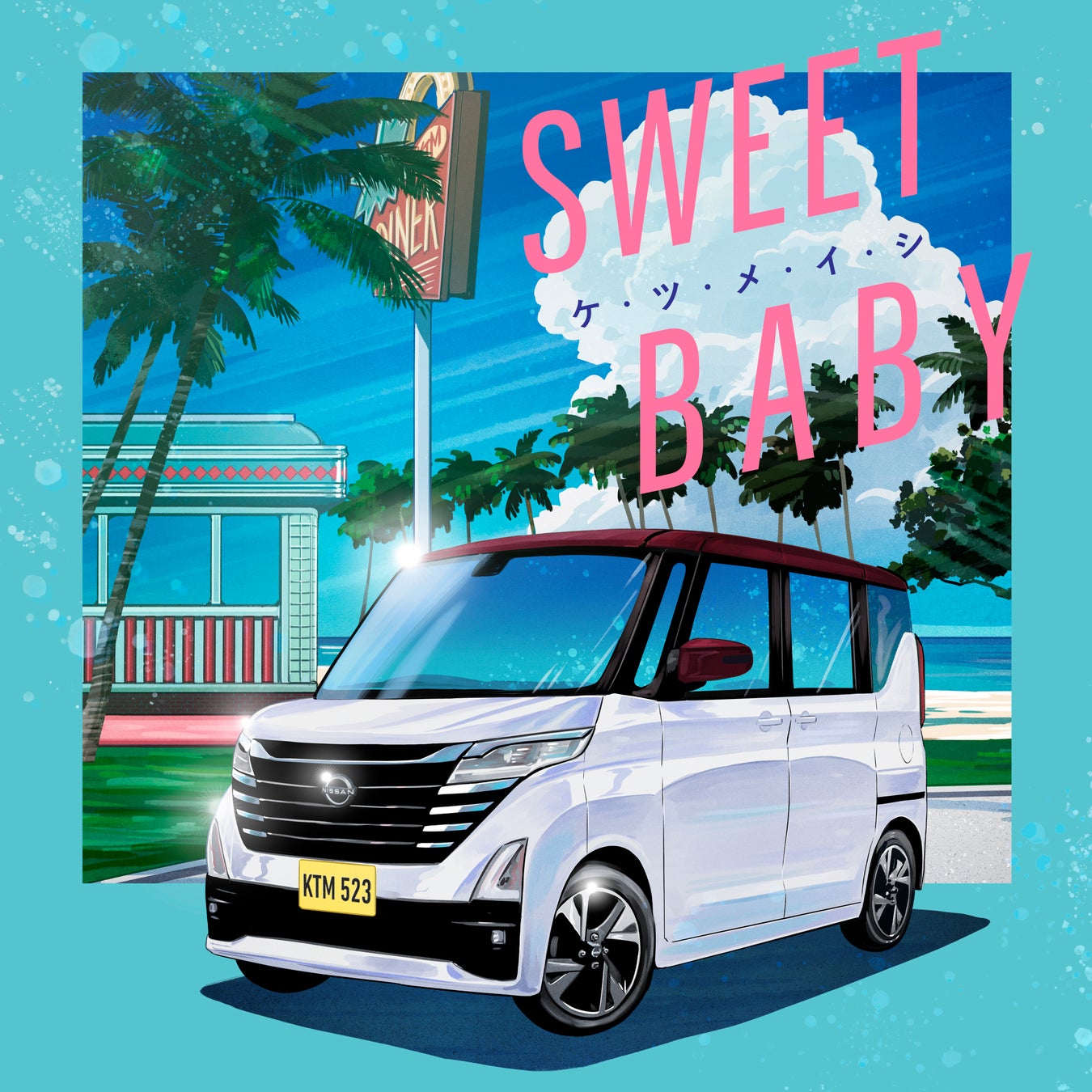 「SWEET BABY」のシングルジャケットは、どこか懐かしいシティーポップを彷彿をさせるイラストの中に、日産「ルークス」が描かれています。今回の楽曲に合った、おもわずどこかにおでかけしたくなるような、楽しく、ポップなデザインに仕上がっています。