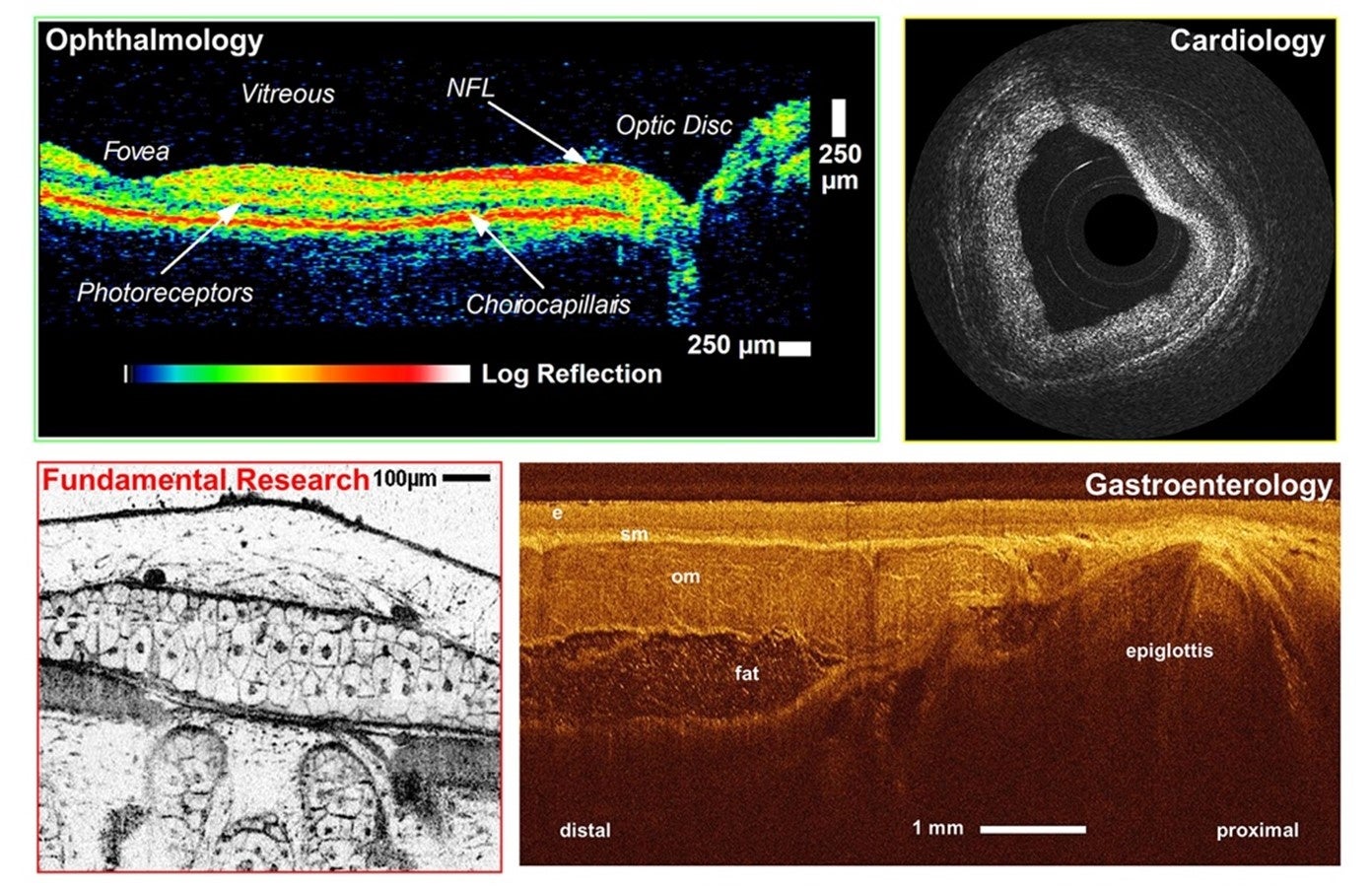 OCTは、超音波に類似したイメージング技術であり、光干渉を利用して反射光の位置と強度を測定し、顕微鏡と同等の解像度で生体組織や物質の表面下構造をリアルタイムに画像化します。この技術は、複数の医療分野だけでなく、基礎研究や製造にも応用されており、ファイバースコープや内視鏡、腹腔鏡と組み合わせることで、体内の撮影が可能です。従来の切除生検のように組織片採取を必要とせず、リアルタイムで画像化する「光生検」を実現します。