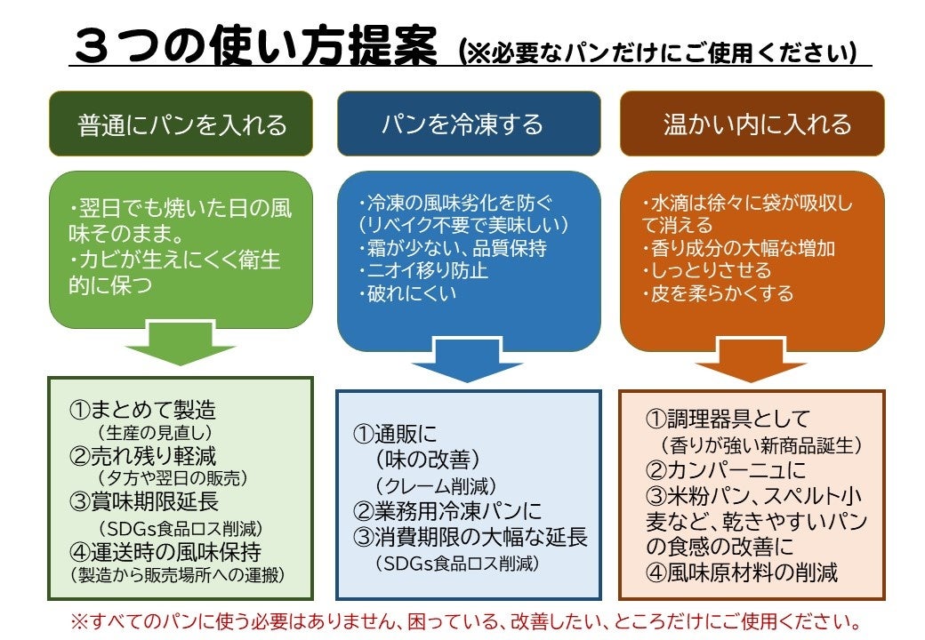 業務用の「パンおいしいまま」は製袋タイプのみでしたが、今回の発売で自動梱包機での「パンおいしいまま」使用が可能となりました。