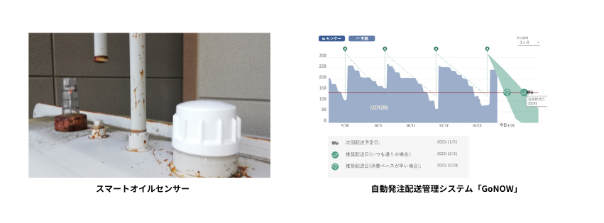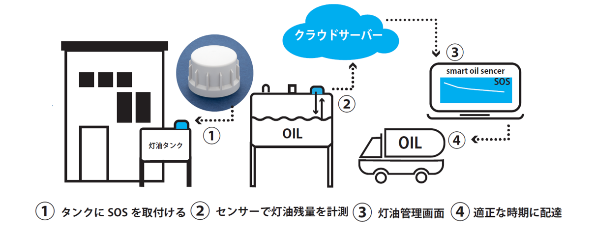 「スマートオイルセンサー(SOS)」を灯油タンクに取り付け、タンク内を遠隔でモニタリング して、灯油残量から自動で配送計画を作成・指示するシステムです。