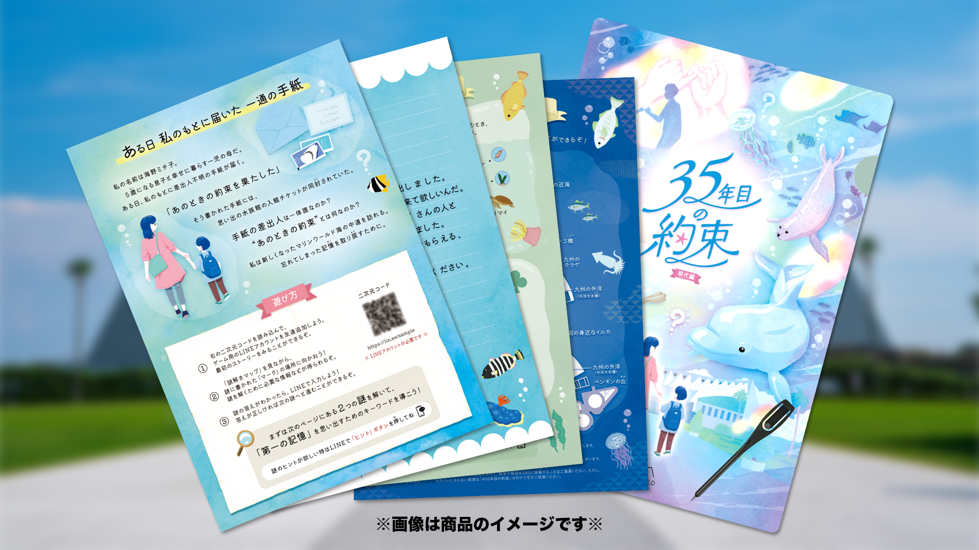 この作品は、2024年に開館35周年を迎える九州最大の水族館「マリンワールド海の中道」の記念作品として製作されました。謎解きを通して、マリンワールドのこれまでの歩みやエピソードを知っていただこうという想いで、設立当時のオープニングスタッフとともに丁寧に作り上げています。
