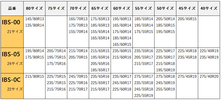 製品ラインナップ及び適合タイヤサイズ