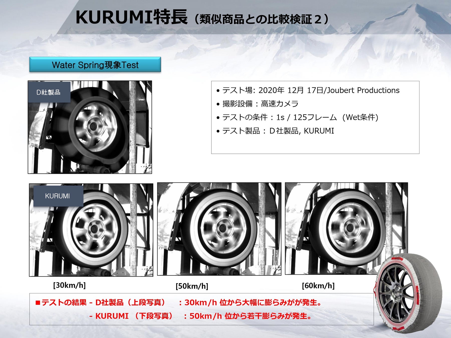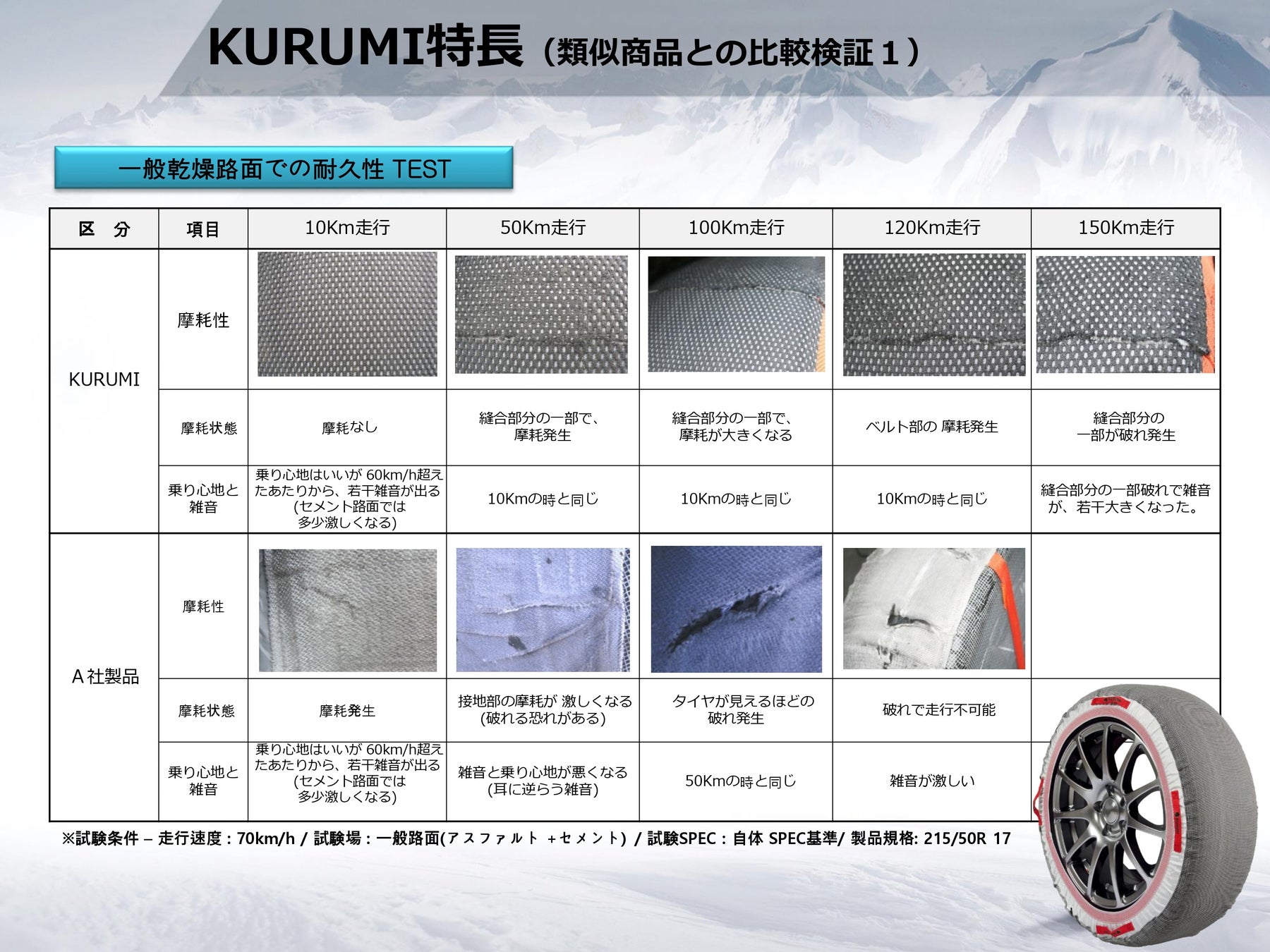 「KURUMI」の最大の魅力は、その軽さと柔軟性により、車内スペースを取らずに収納できることです。これにより、車内のスペースを有効活用でき、車載時の燃費への影響も最小限に抑えることができます。また、取り付けも非常に簡単で、タイヤに被せるだけでしっかりと装着できます。