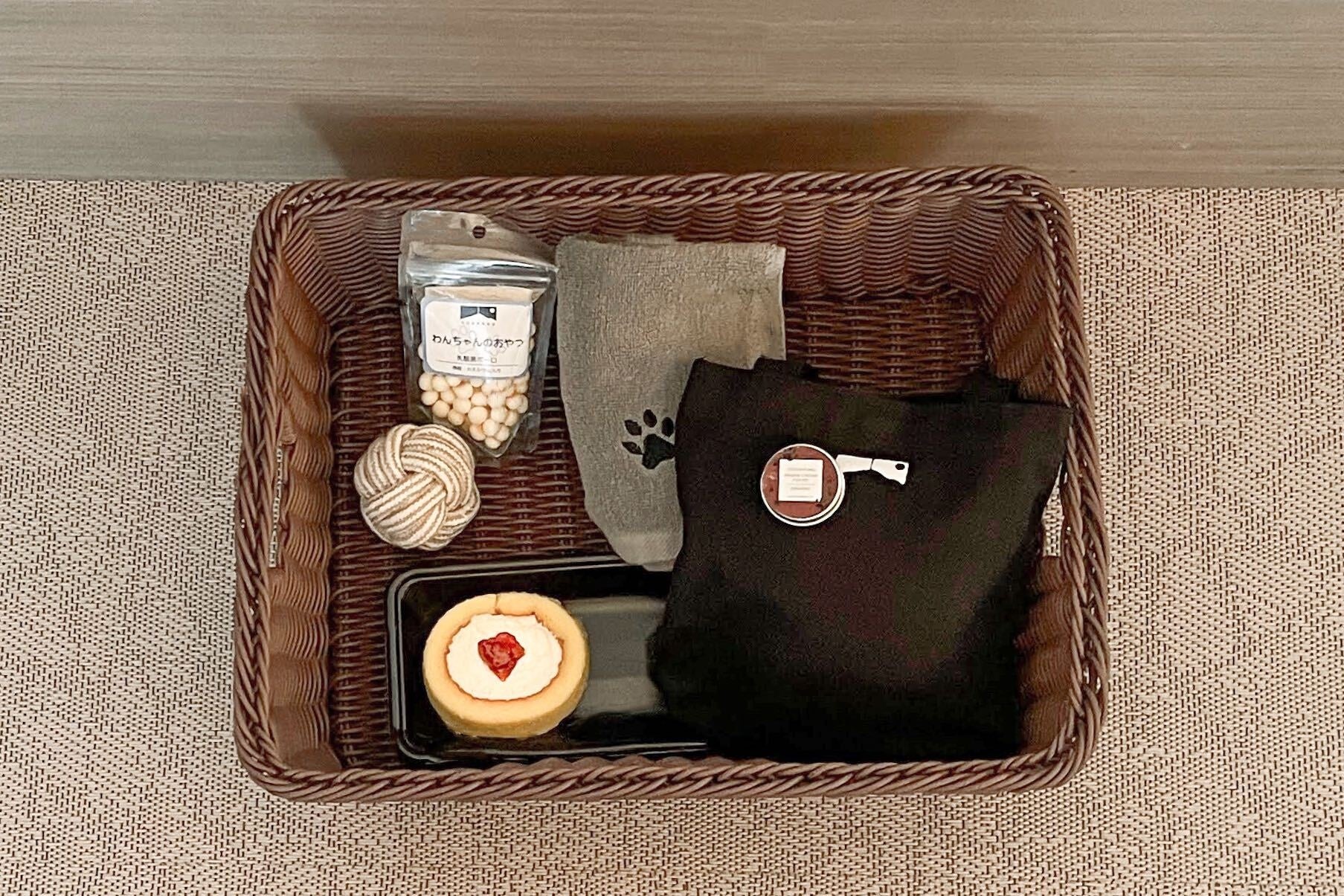 わんちゃん用アメニティグッズ:おやつやおもちゃ、パウケアクリーム、タオルなど