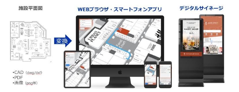 お客様が保有する施設平面図をデジタル化し、屋内デジタルマップの作成・維持管理ができるだけでなく、フロアマップや施設案内といった訪問客向けサービスまで提供が可能なサービスです。