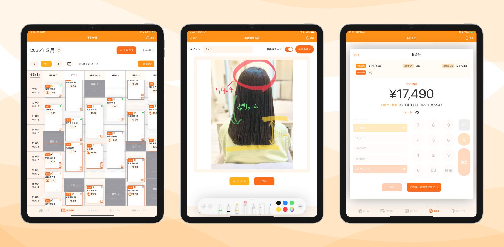 予約管理・顧客管理・レジ会計・売上集計など基本的な顧客管理POSレジ機能の他に、電子カルテ、サロン専用の予約サイトなど、あらゆる機能を完備。