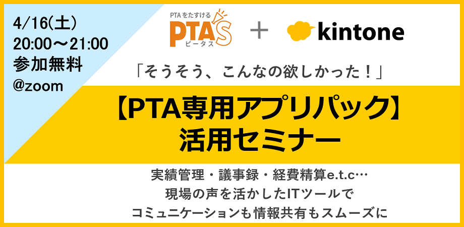 ※セミナー参加時は必要ありませんが、実際に【PTA専用アプリパック】をご利用いただくには、「チーム応援ライセンス(kintone)」へのご契約が必要です。