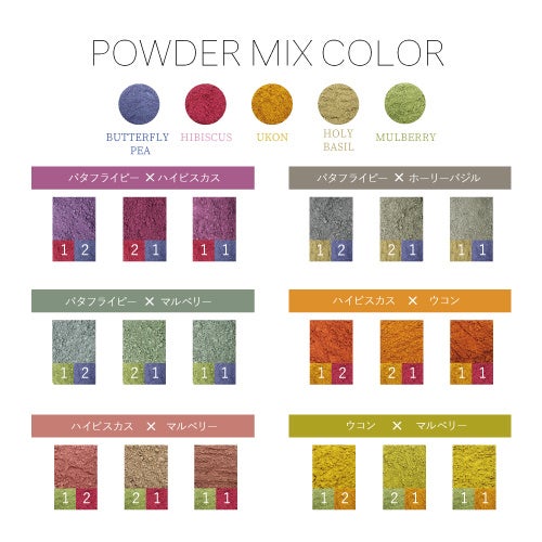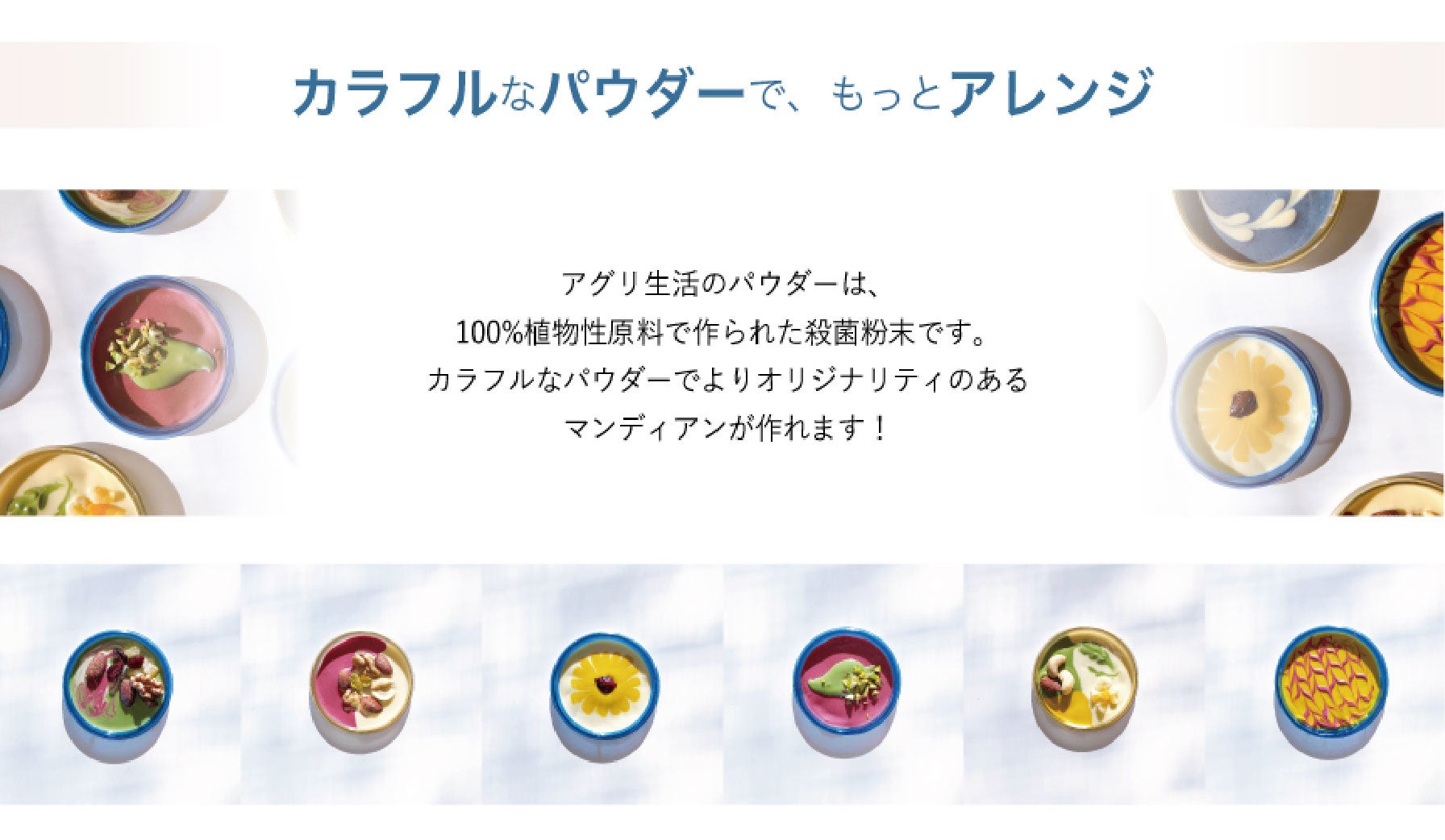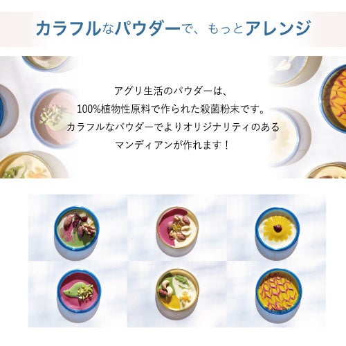 また、アグリ生活で発売中の他のパウダーを組み合わせる事で絵具のように色の配合を楽しみながらカラフルなマンディアンを作る事ができます。